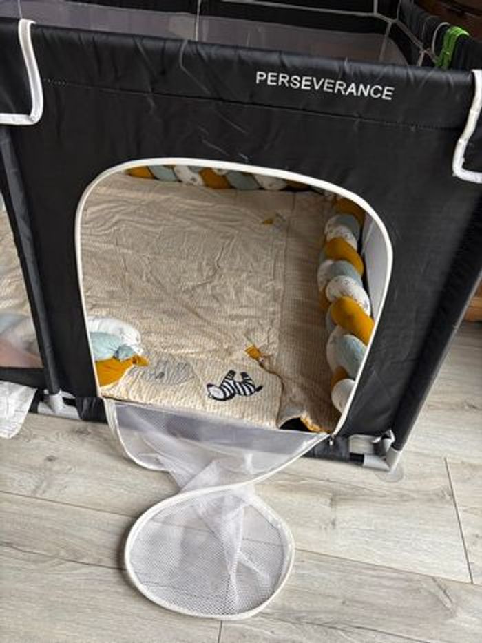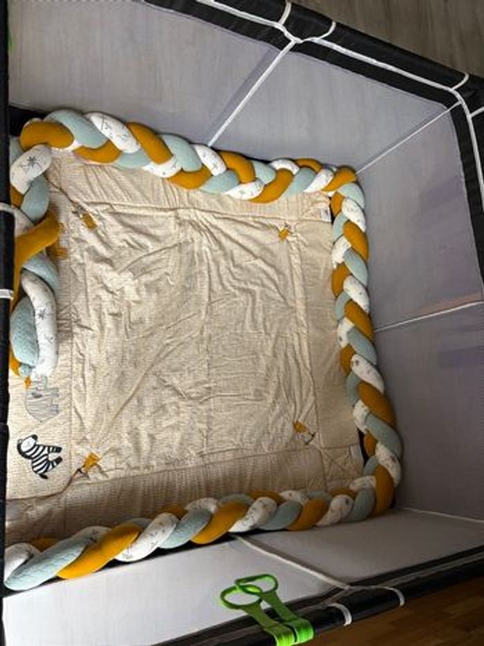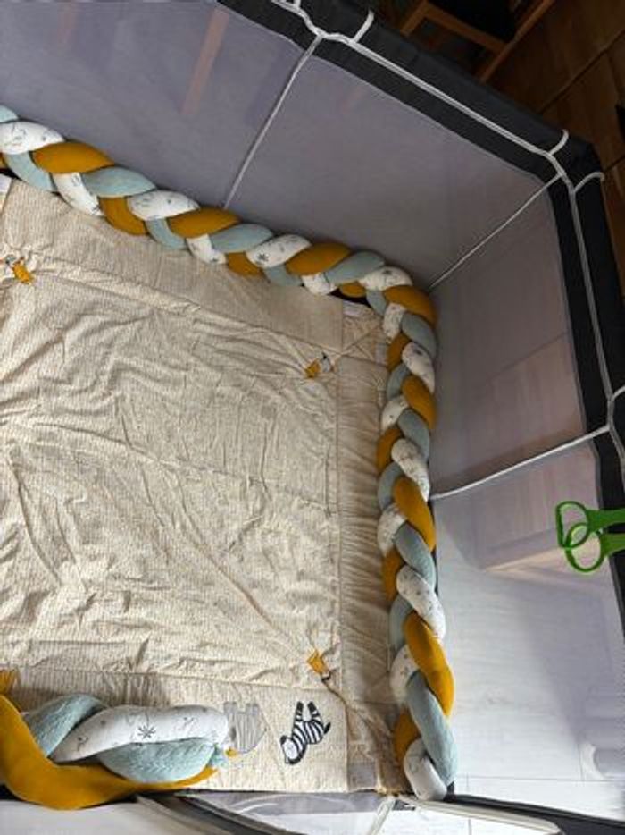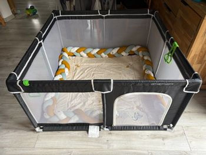 🥳 reduc avec les lots Persévérance parc en tissu noir passe partout Hyper simple à monter et démonter Ventouses pour le sol Environ 130 x 130 x 65 de haut Bon état général , j’y ai mis un coup de désinfectant, un peu de nettoyage mais il se peut qu’il en nécessite un autre selon les exigences. les barres sont nickels, pas tordues, les scratch collent, le grillage pas de trous, a servi pour 2 enfants Le tapis (125x125 avec arche 20€) et la tresse (env 430cm 25€) sont vendus séparément Les poignets pour aider à se lever sont fournies avec le parc