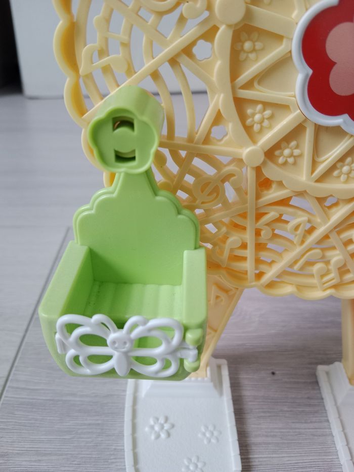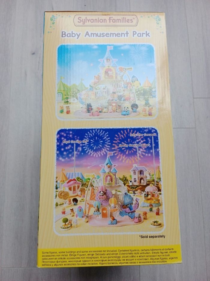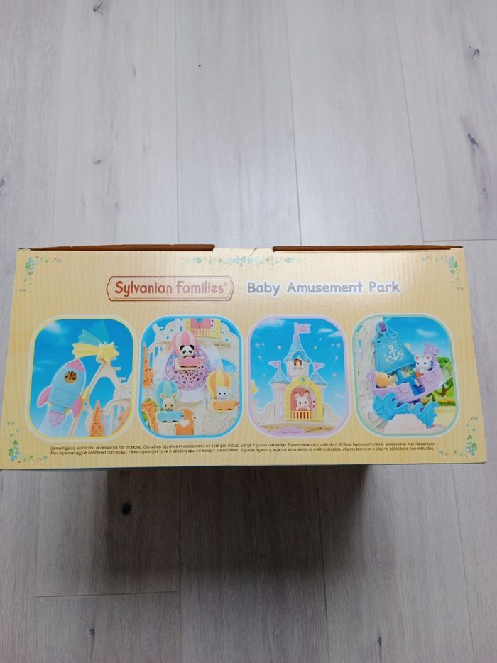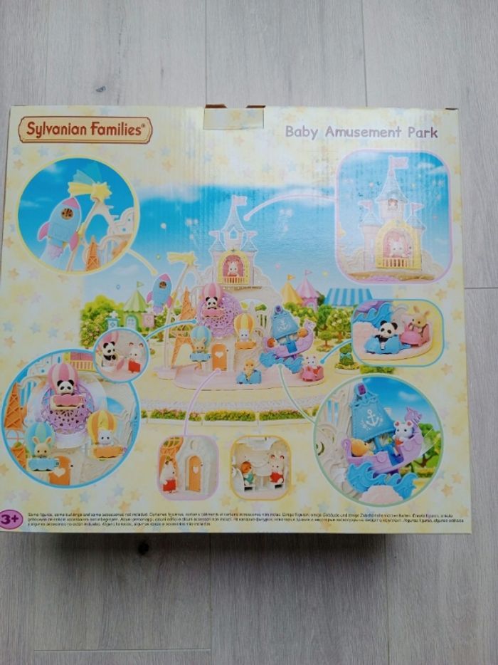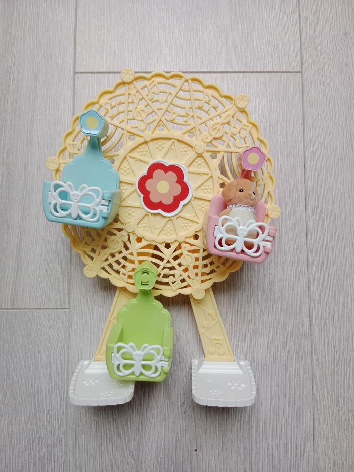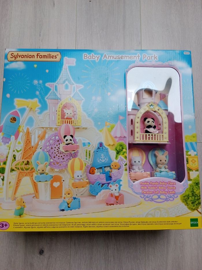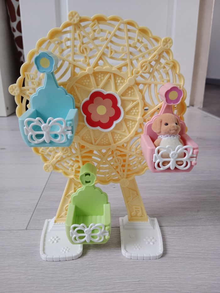 Lot Sylvanian Families Parc d'attractions féerique Sylvanian Families 5537/ Baby amusement Park avec 3 figurines et accessoires. Neuf dans son emballage scellé + Grande roue avec figurine chiot. État correct : la barrière sur la balancelle verte a été cassée et recollée donc il faut manipuler avec précaution et il manque un autocollant fleur au niveau de cette même balancelle