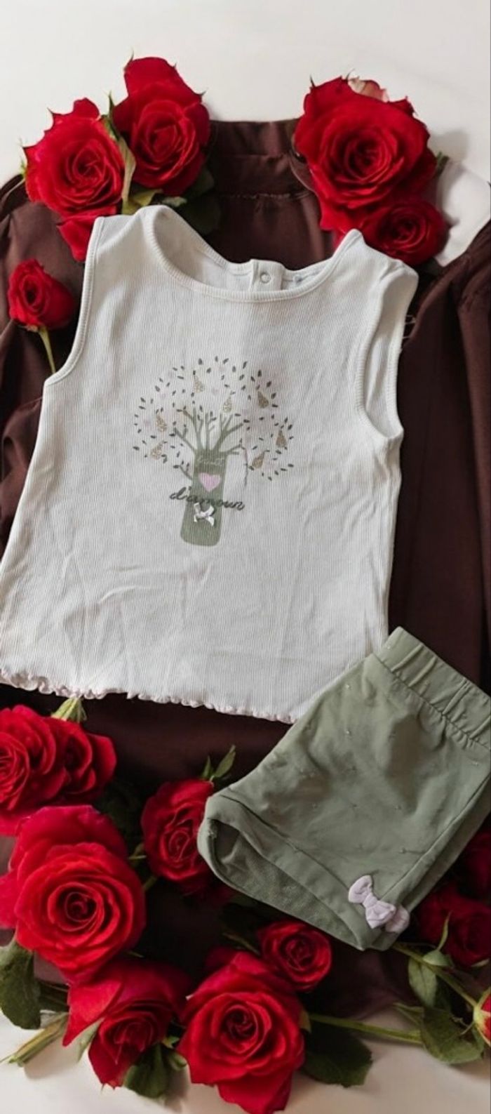 🌹 Nensemble neuf 🌹taille 36 mois 🌹orné d'un joli motif d'arbre printanier avec de petits détails roses .Le short est de couleur kaki uni, avec une taille élastiquée et un petit nœud décoratif sur le bas du short