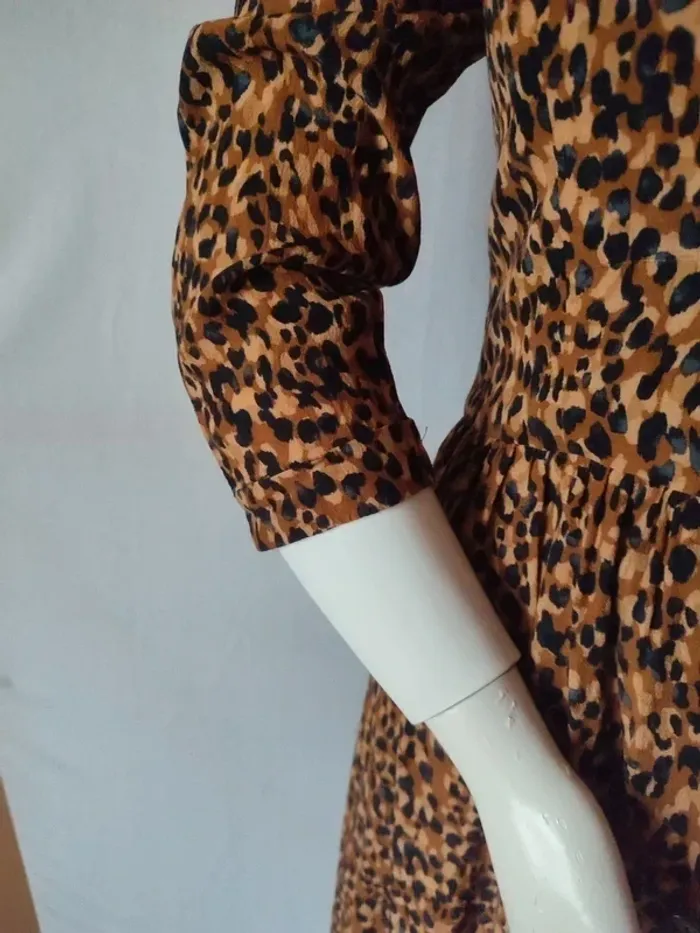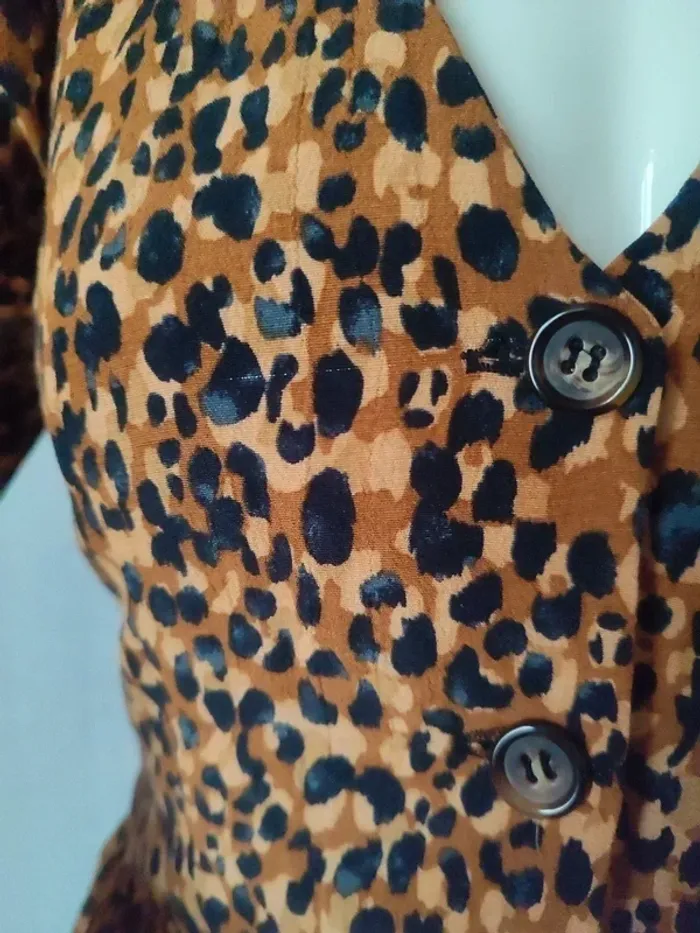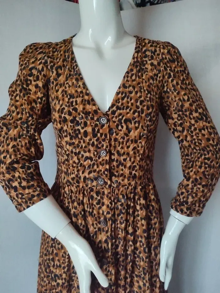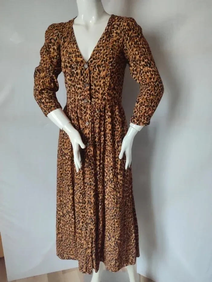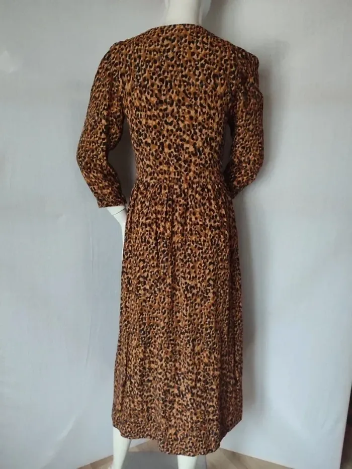 Robe longue, imprimée, manches 3/4. Col en V. Boutons sur tout le devant. Un tout petit défaut peu visible.