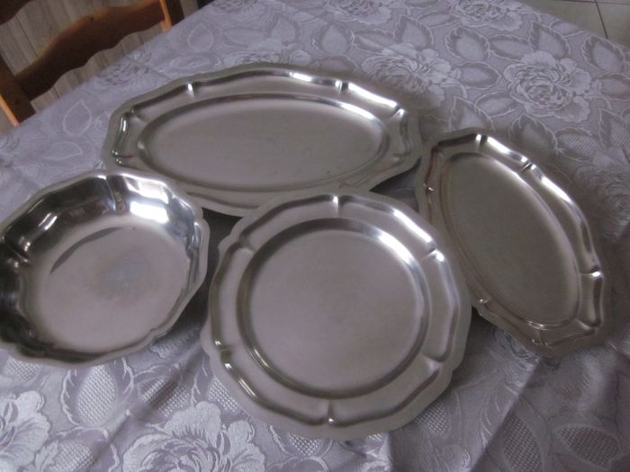 4 plats inox, 40 x 27 cm + 30 x 19 cm + diamètre 28 plat + diamètre 24 haut