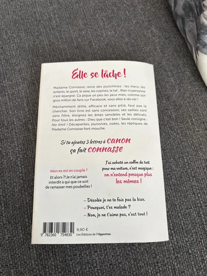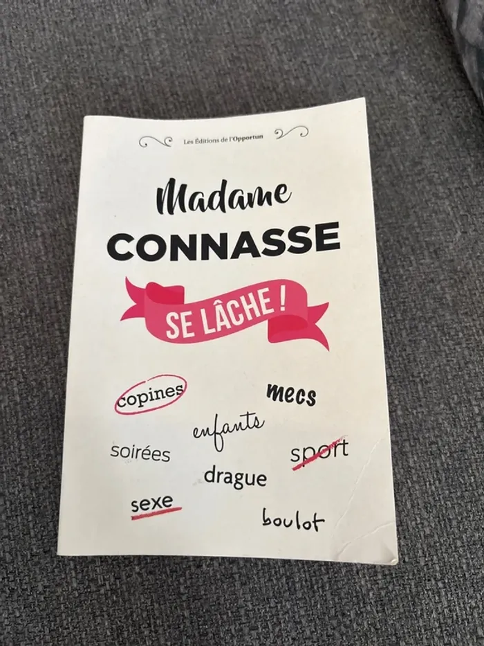 Madame Connasse se lâche Je vends le livre Madame Connasse se lâche, parfait pour les fans d’humour décalé et de situations cocasses. 📖 État : aucune déchirure ni annotations. 💬 Idéal pour rire, se détendre ou offrir en cadeau. 📦 Envoi rapide et soigné. Mots-clés : #Humour #Drôle #MadameConnasse #Lecture #Cadeau #Rire #LivreOccasion #Femme #Décalé