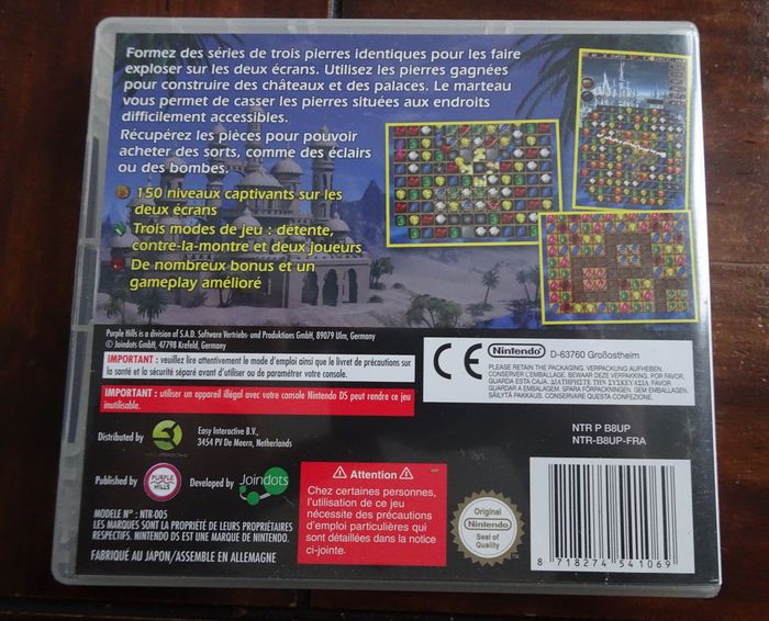Jeu de réflexion qui consiste à former des séries de 3 pierres identiques pour les faire exploser sur les 2 écrans. Dès 3 ans. Jeu complet en très bon état, avec boite et notice.