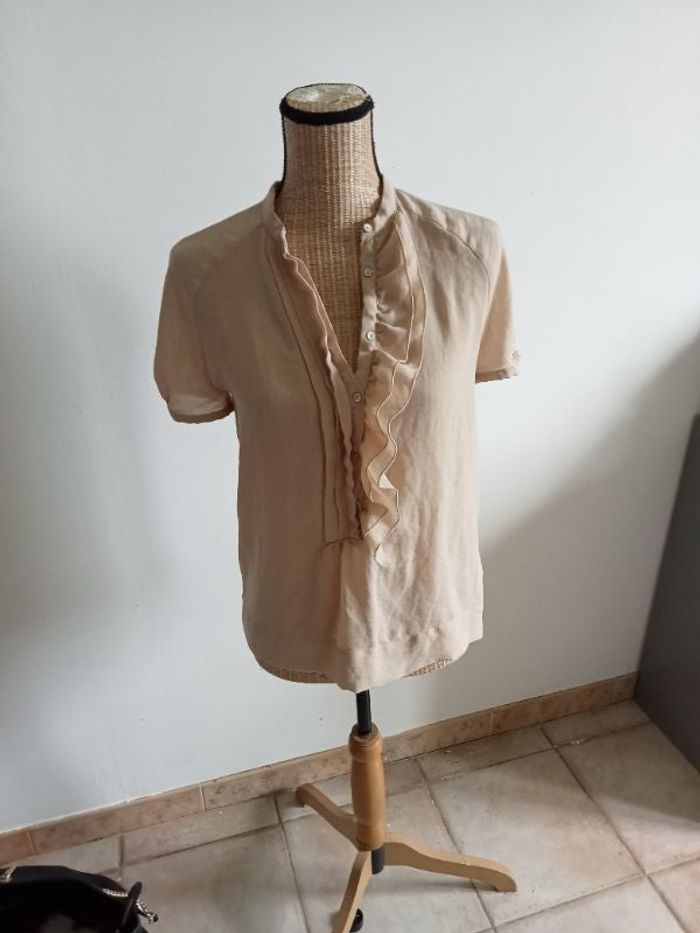 Chemisier beige manches courtes à volants. En polyester. Taille S