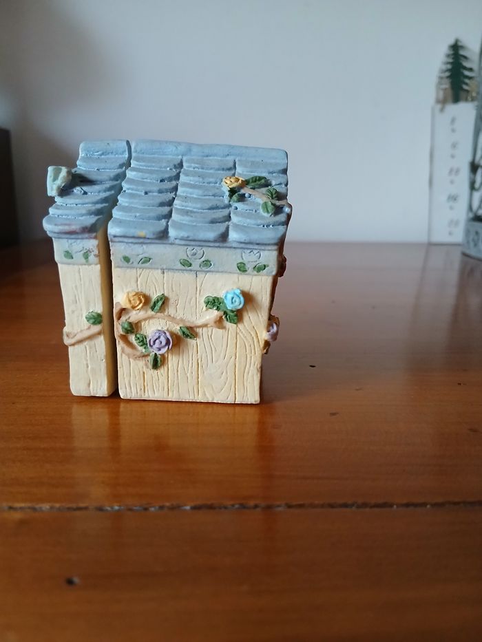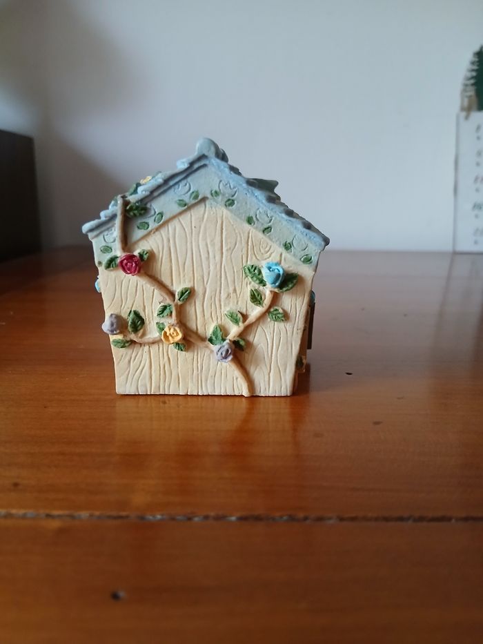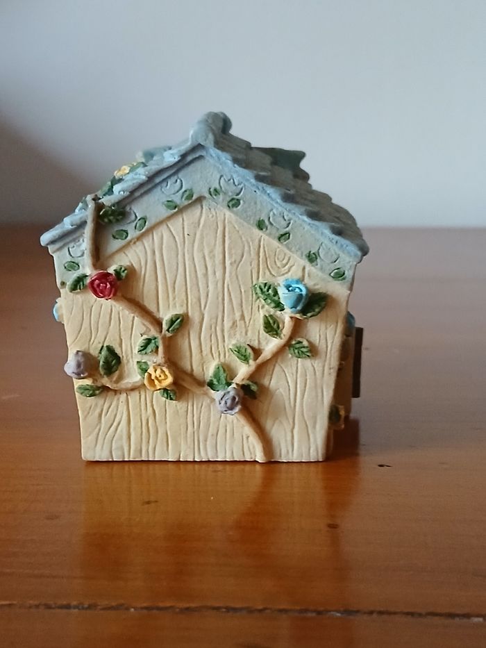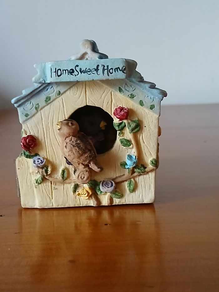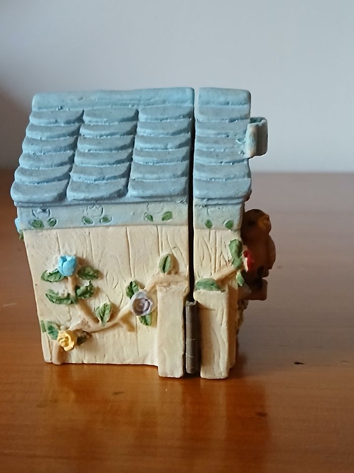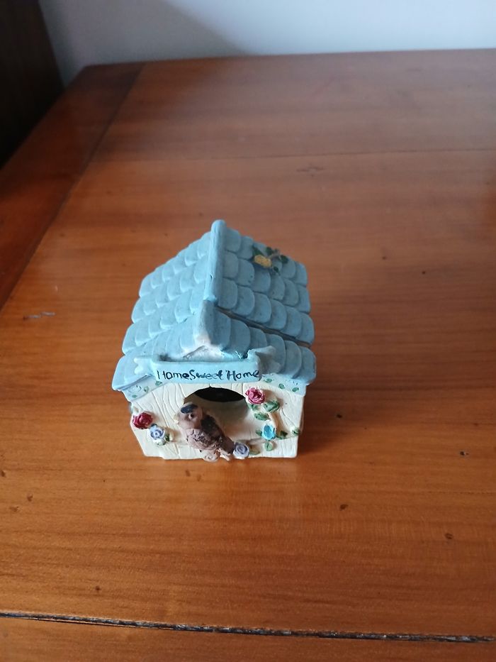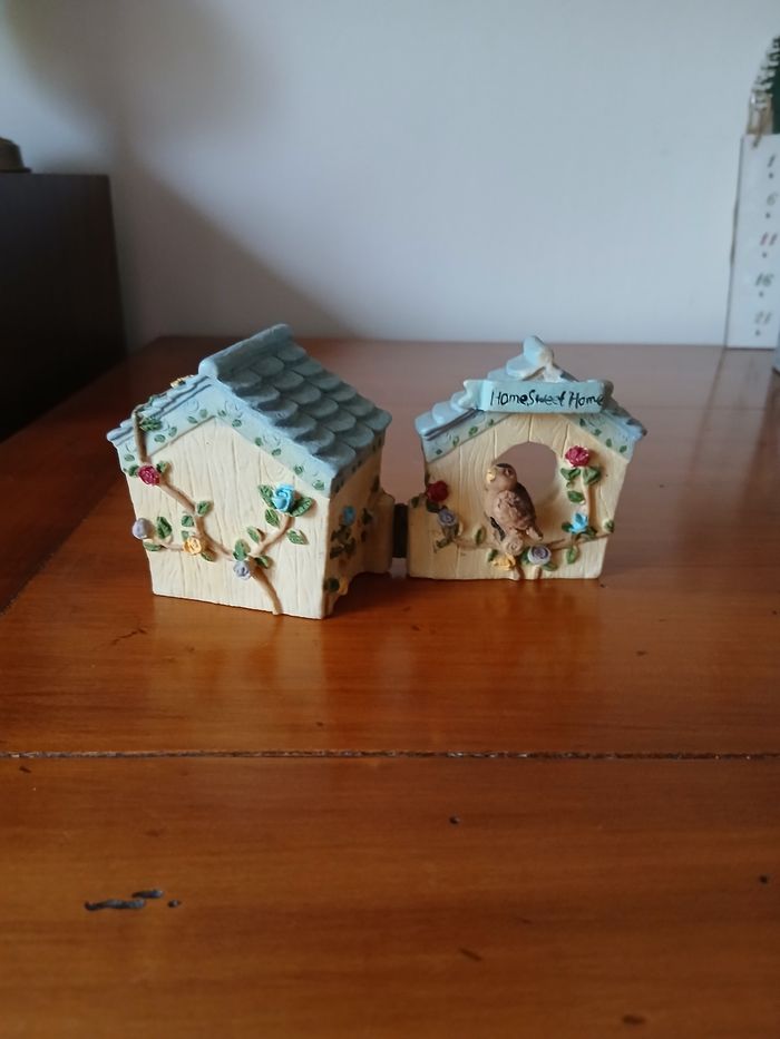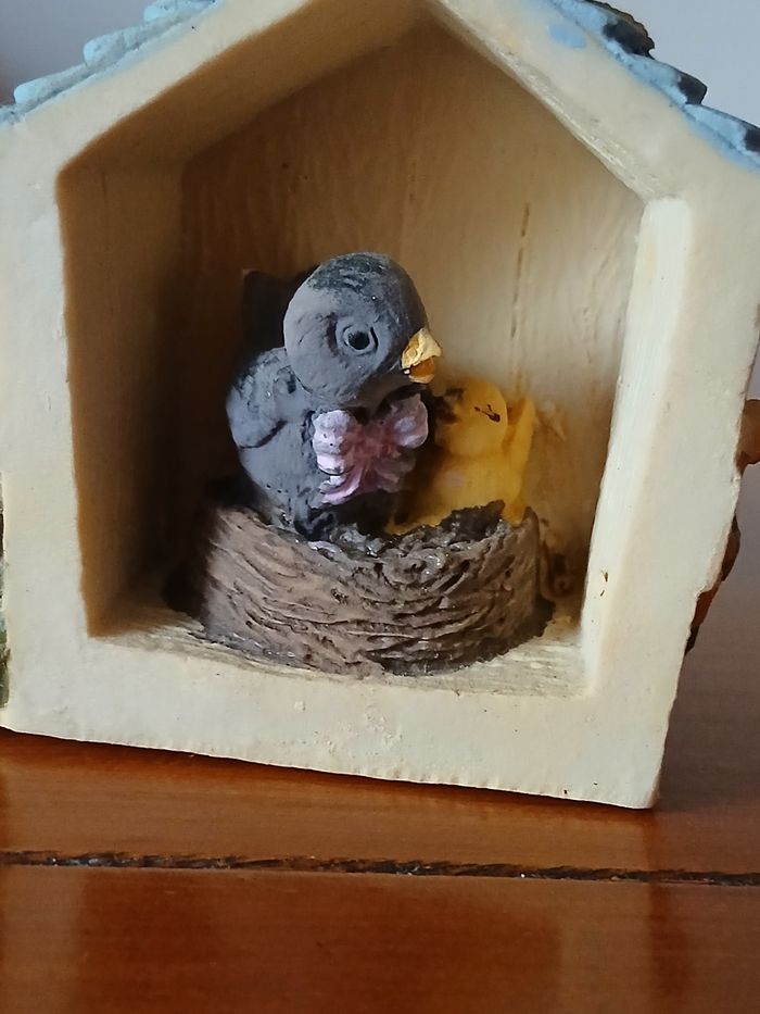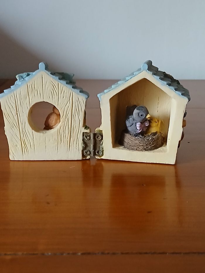 Maisonnette/ décoration miniature dépliable; en résine. Devant : petit oiseau en relief. Motif floral sur les autres faces. Intérieur : Maman Oiseau et son petit, dans un nid. Hauteur maxi de 6 cm; largeur dépliée de 12 cm // voir photos pour détails. À Noter : trace étiquette prix dessous