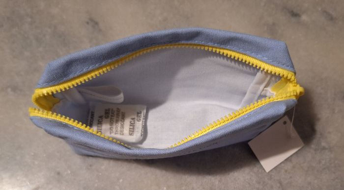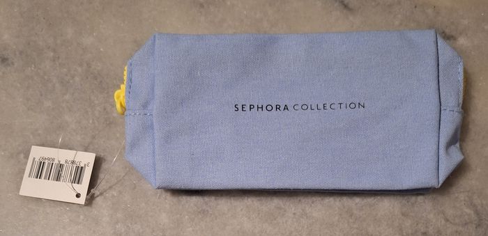 Trousse à maquillage bleu ciel imprimée au nom de la marque Sephora, avec fermeture éclair jaune. En coton recyclé et polyester.