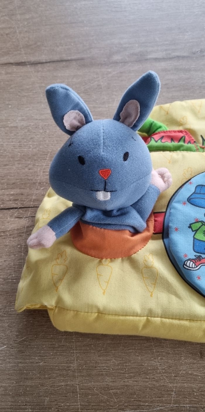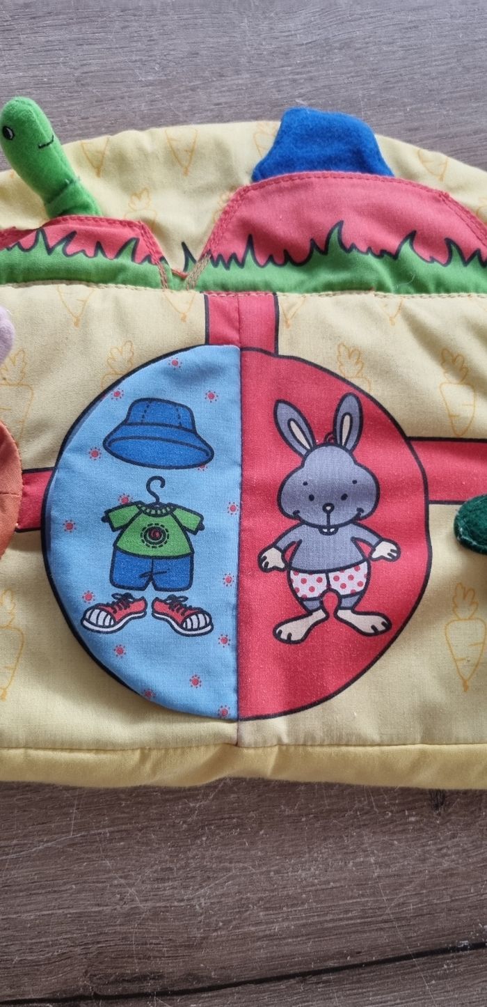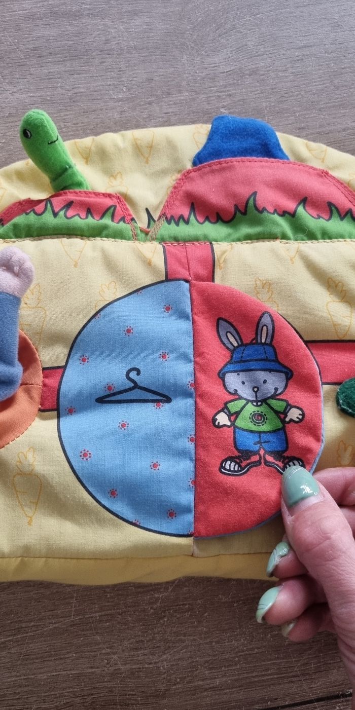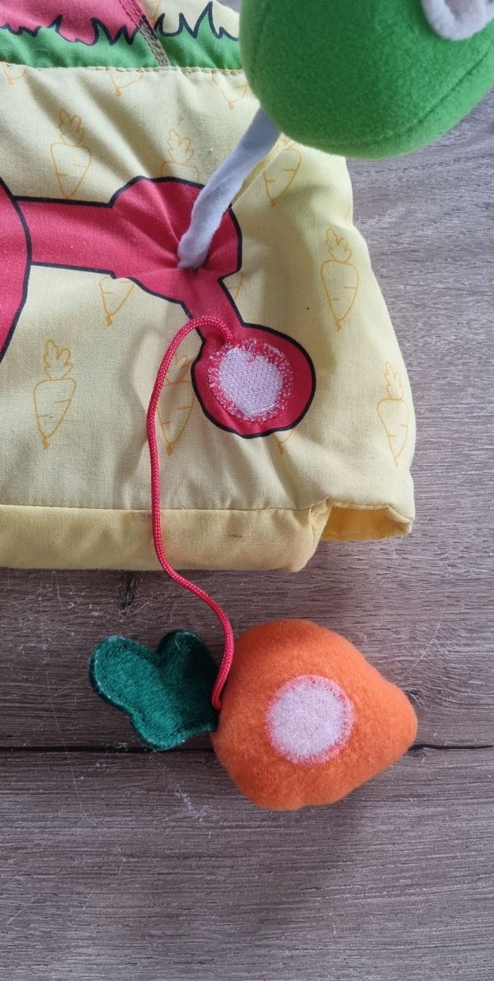 Planche d'activités sensorielles en tissus Lapin à tirer pour qu'il vibre, hochet carotte à scratchs, ver de terre et fleur à tirer (bruit de papier froissé), pages à tourner Se fixe à la tablette de la chaise haute Modèle vintage Très bon état