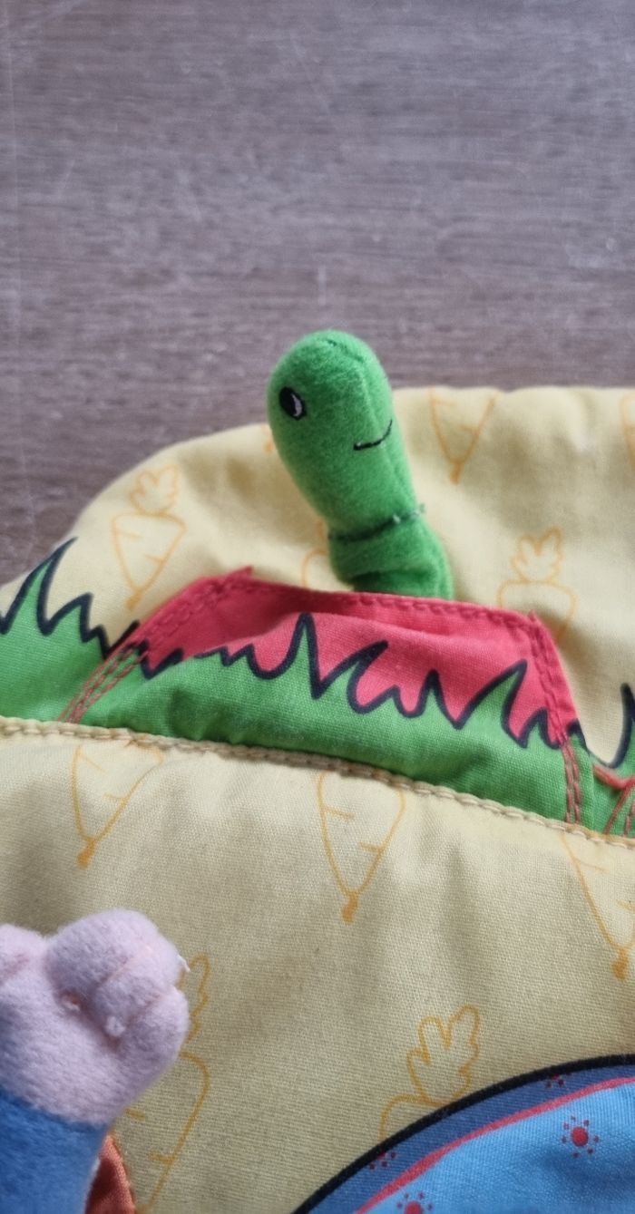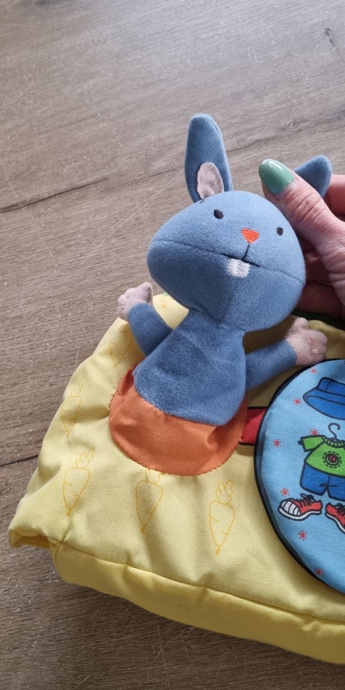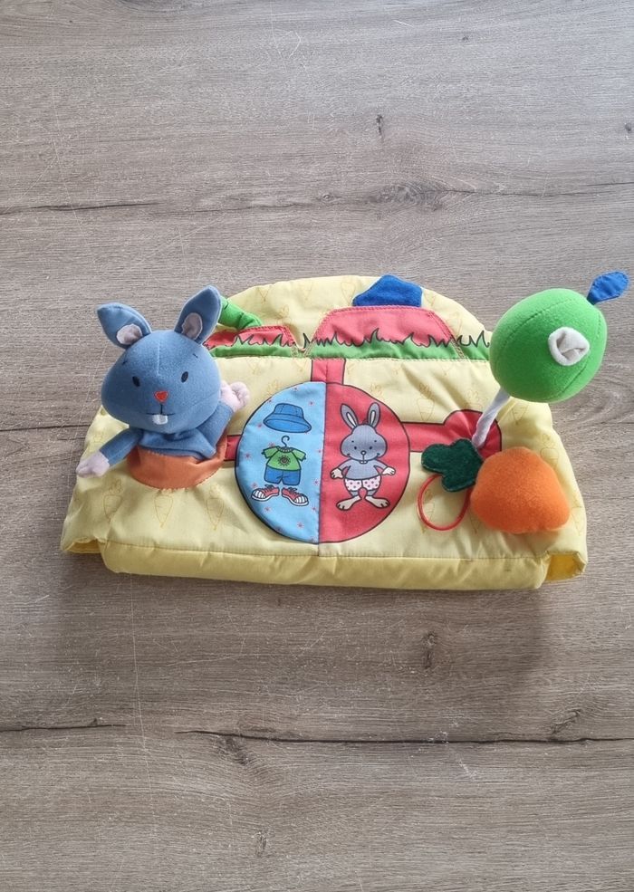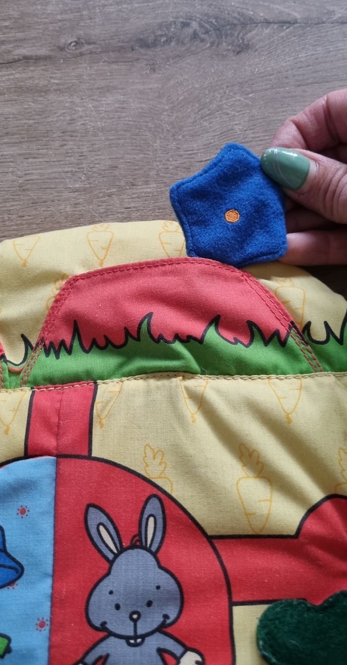Planche d'activités sensorielles en tissus Lapin à tirer pour qu'il vibre, hochet carotte à scratchs, ver de terre et fleur à tirer (bruit de papier froissé), pages à tourner Se fixe à la tablette de la chaise haute Modèle vintage Très bon état