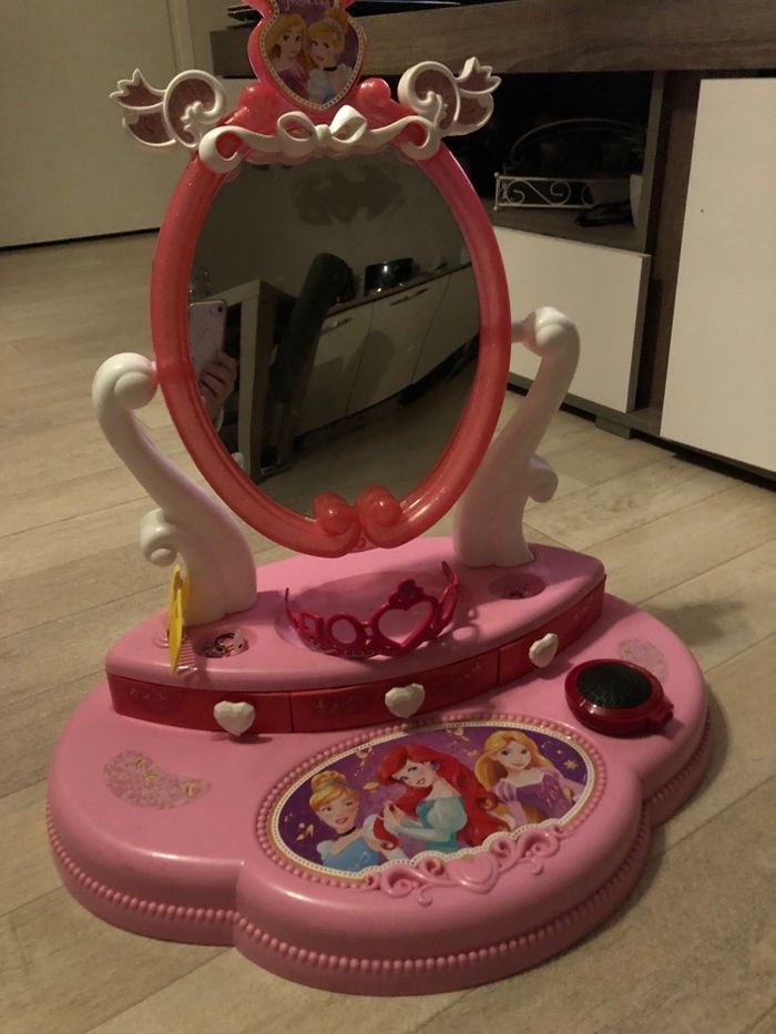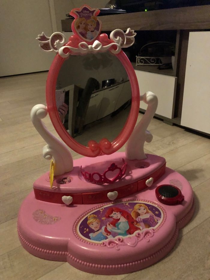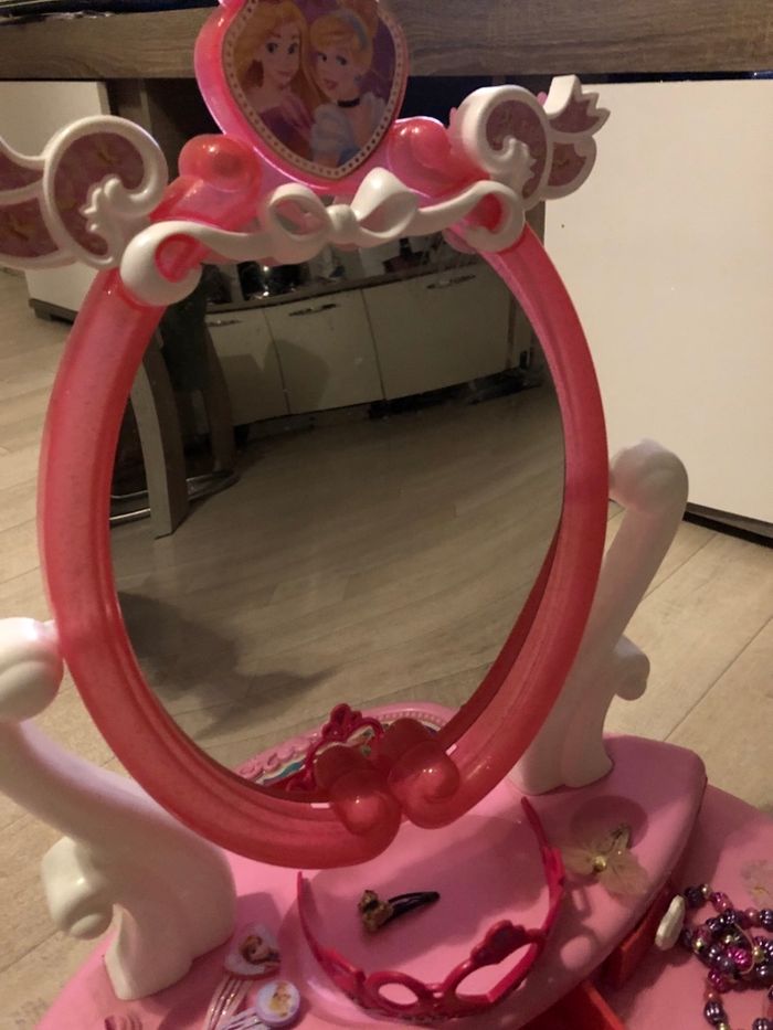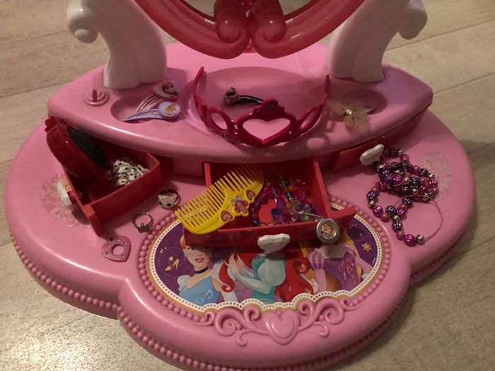 Disney Princess Coiffeuse. Grand espace de rangement, support miroir Plusieurs articles peigne couronne bague colliers pinces vendus avec. Pour les enfants de 3 ans et plus. Coiffeuse Princesse Disney avec grand espace de rangement et miroir pivotant.
