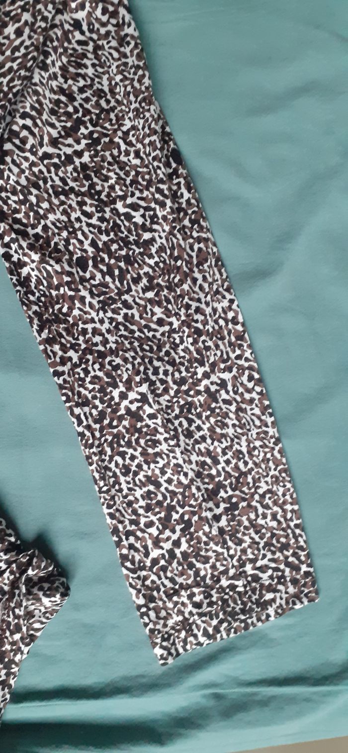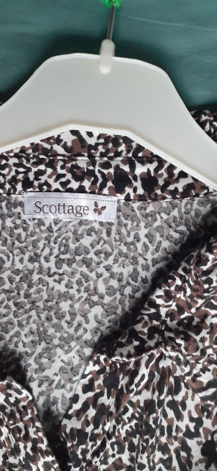 Vends un top long 100 % viscose, tissu lourd et chaud, manches droites, col chemisier, couleur blanc cassé avec motifs léopard noir et prune, marque Scottage, taille 46. Longueur de l'épaule à la base : 67 cm Largeur aisselle à aisselle : 56 cm.