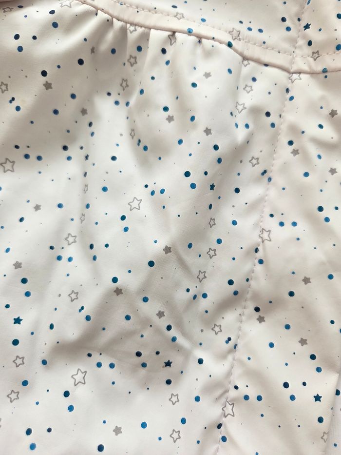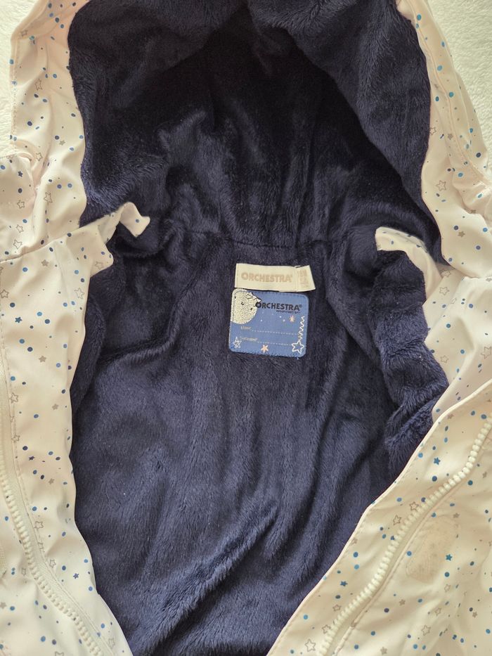 Manteau imperméable intérieur chaud. Sans tâches ni trous juste y’a un autre vêtement rose qui avait déteint dessus je l’ai rattrapé au percarbonate mais il reste quelques reflets a certains endroit mais reste discret