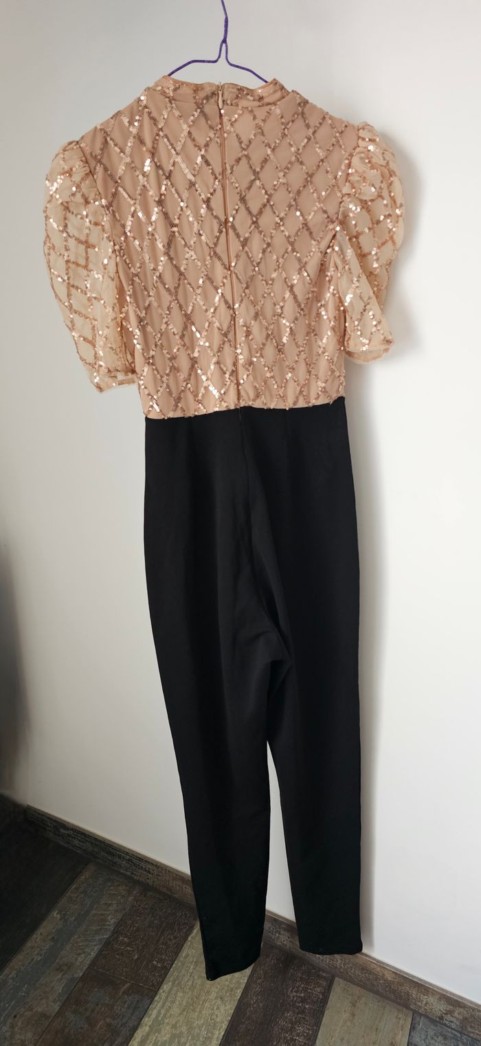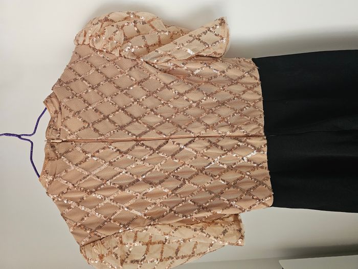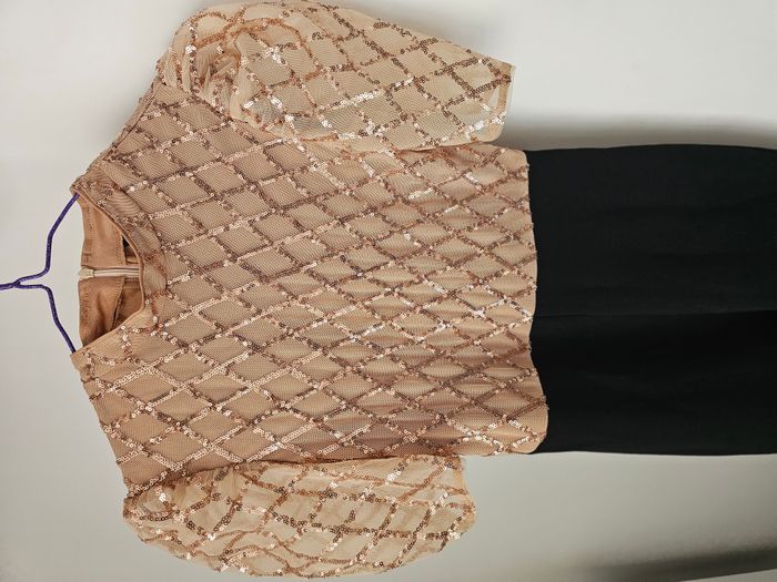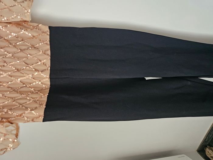 combinaison dorée Shein avec un haut pailleté et un pantalon noir. - Type de produit : Combinaison - Marque : Shein - Taille : 34 - XS - Couleur : Doré / Bronze / Cuivre - Matière : Polyester - Caractéristiques : Haut pailleté, Pantalon droit