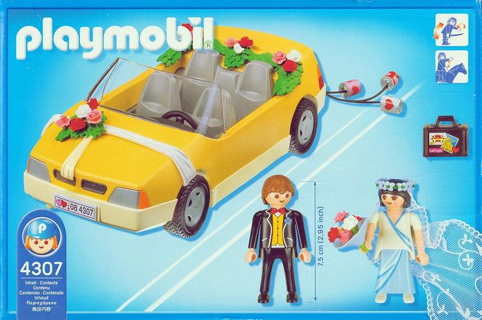 Playmobil 4307 Voiture des mariés Produit neuf dans son emballage d'origine non ouvert. Avec 2 personnages, une voiture et beaucoup d'autres accessoires ! NE CONVIENT PAS AUX ENFANTS DE MOINS DE 5 ANS ! PETITES PIECES RISQUE D'ETOUFFEMENT !