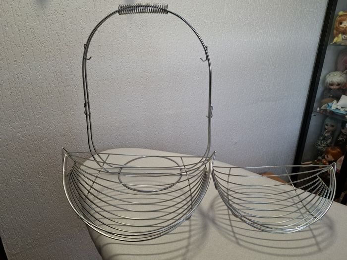 Belle et grande corbeille à fruits sur 2 niveaux, en acier argenté, dimensions : hauteur : 46.50 cm, longueur : 33 cm, largeur : 26 cm. Paniers amovibles de grande contenance, idéale pour présenter fruits, pains ou viennoiseries avec style. En très bon état.
