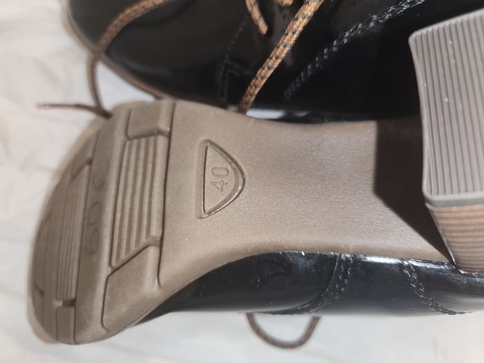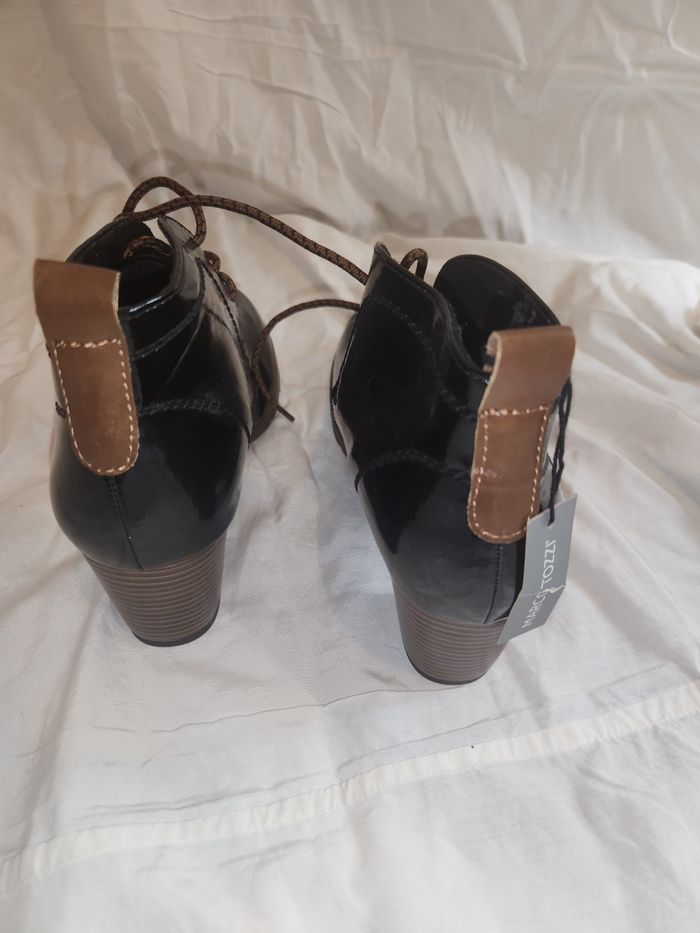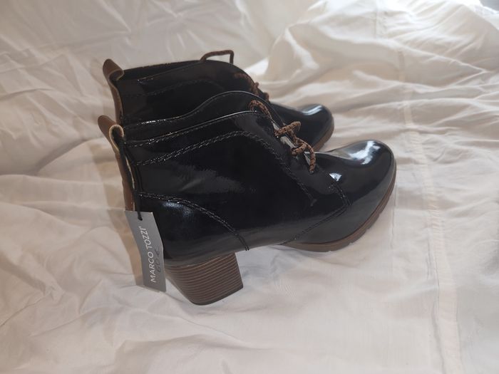 chaussure, bottine, marco tozzi, neuf, 40, bottines à talons, verni, noir, lacet, chukka, automne, hiver, tendance, élégant, mode femme, cuir, escarpin
