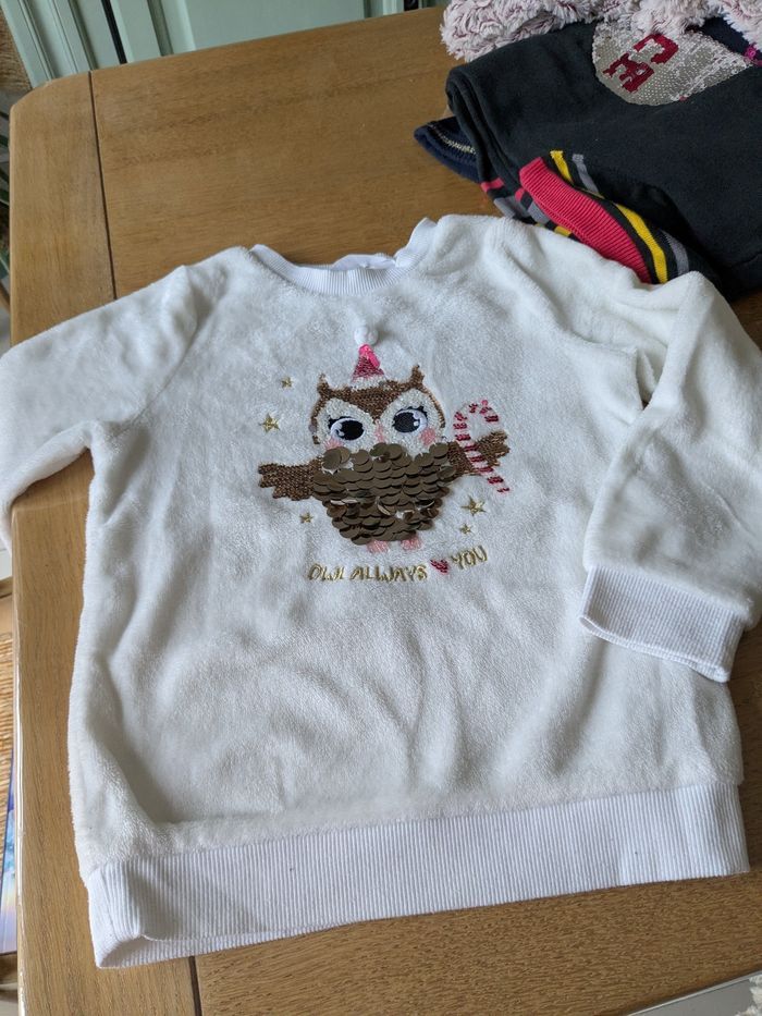 Pull fille 4-6ans blanc effet velours ras motif chouette sequins idéal fêtes
