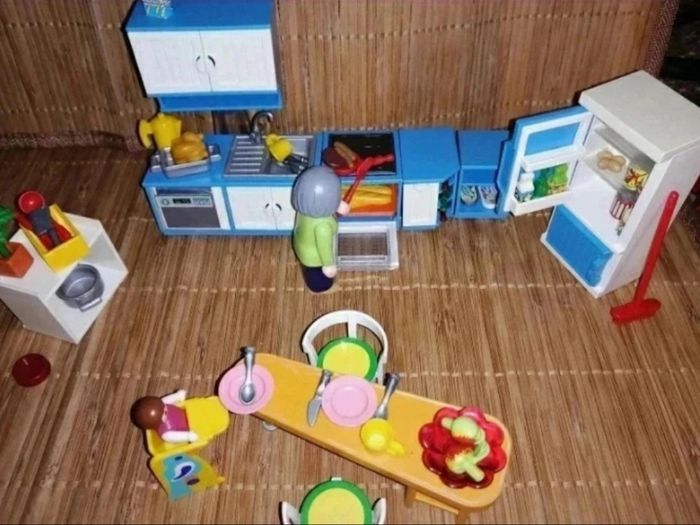 Manque suivant modèle original : 1 tapis, 1 chien, 1 gamelle, 1 chien, 1 cafetière, 1 fromage, 1 pelle & balayette.