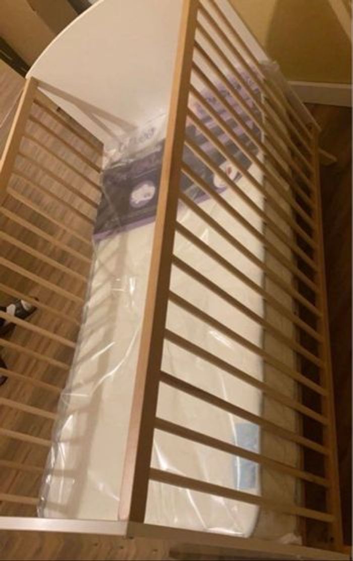 - lit à barreaux bébé 60x120 blanc et bois + le matelas 60x120 (sans le plastique qu’il ya sur la photo car utilisé) + housses et protège matelas.