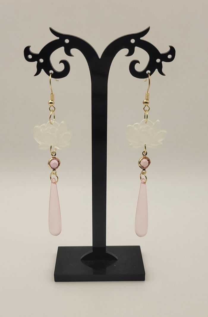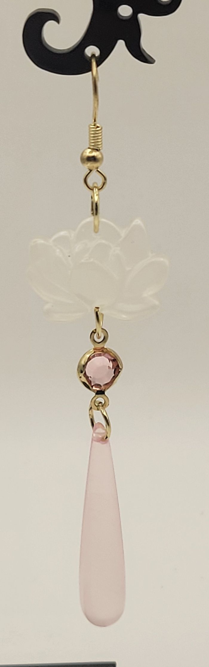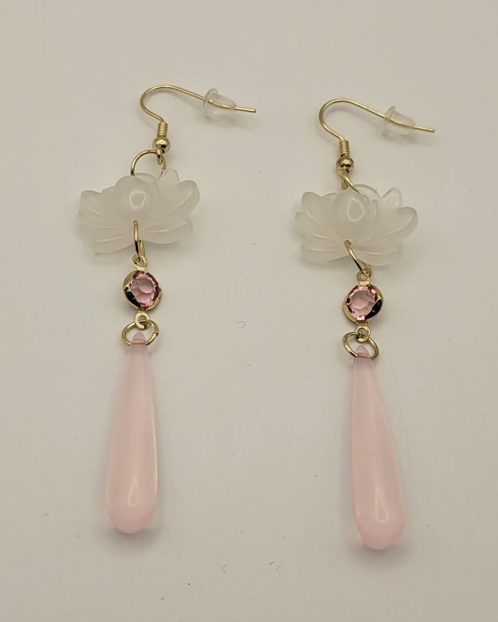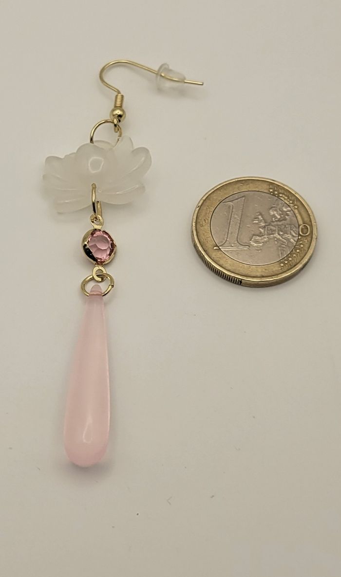 BOUCLES D'OREILLES PENDANTES LOTUS GOUTTE D'EAU ROSE ! NEUVE ! - photo numéro 3