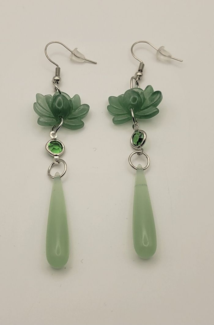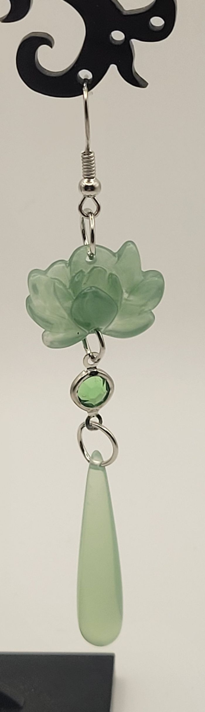 BOUCLES D'OREILLES PENDANTES LOTUS GOUTTE D'EAU VERT ! NEUVE ! - photo numéro 3