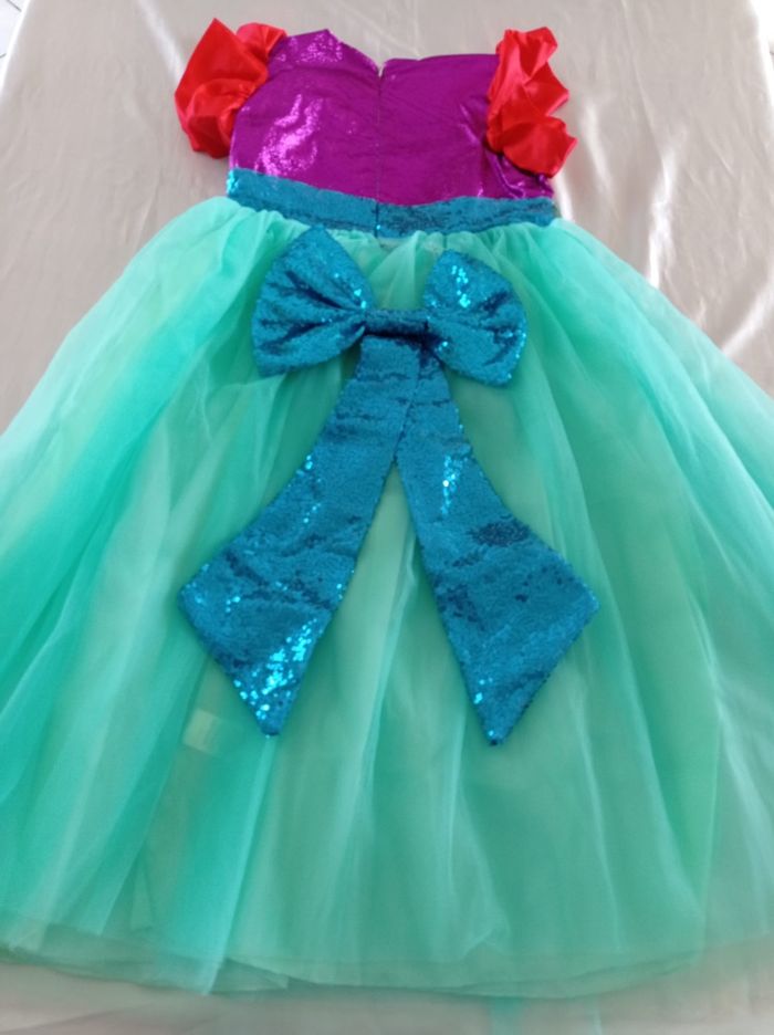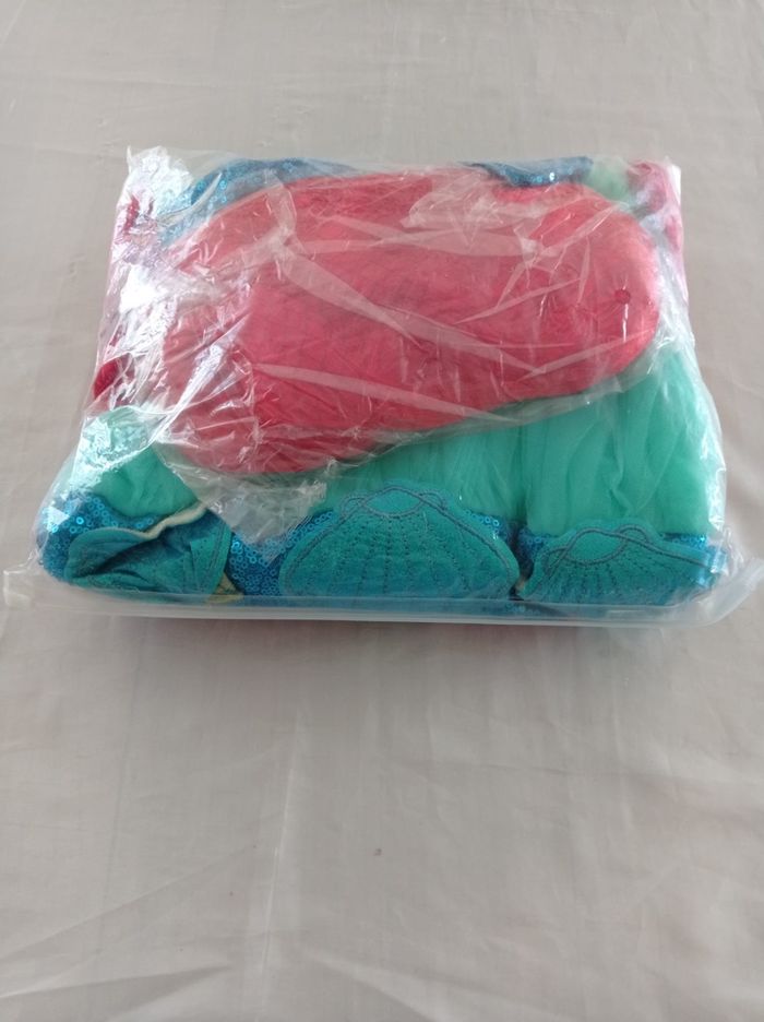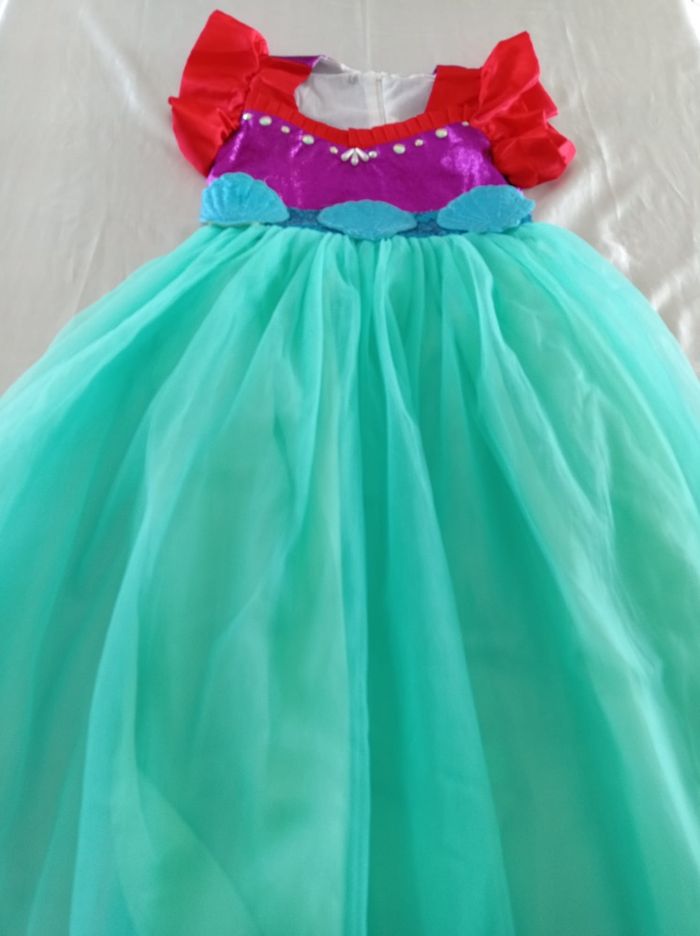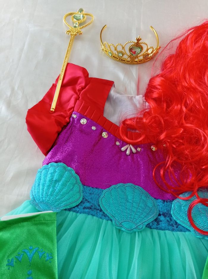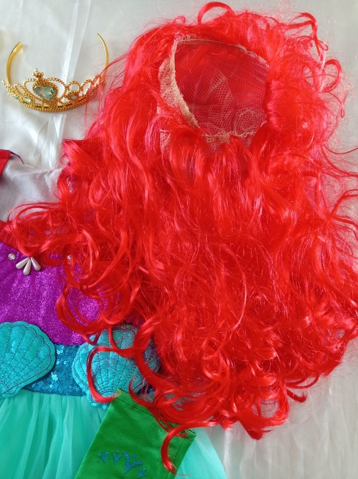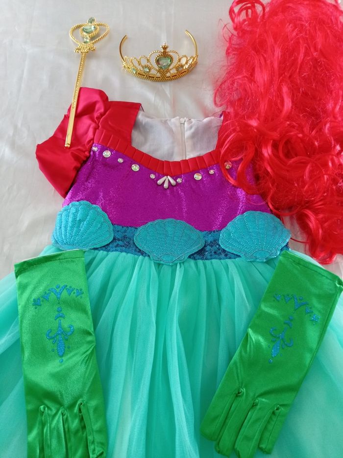Déguisement robe princesse sirène et ces accessoires (couronne, baguette, gants, perruque, noeud). La robe mesure 90cm, la taille convient aux petites filles de 6ans. Totalement neuve, vendue dans son emballage d’origine. Expédition rapide après votre commande