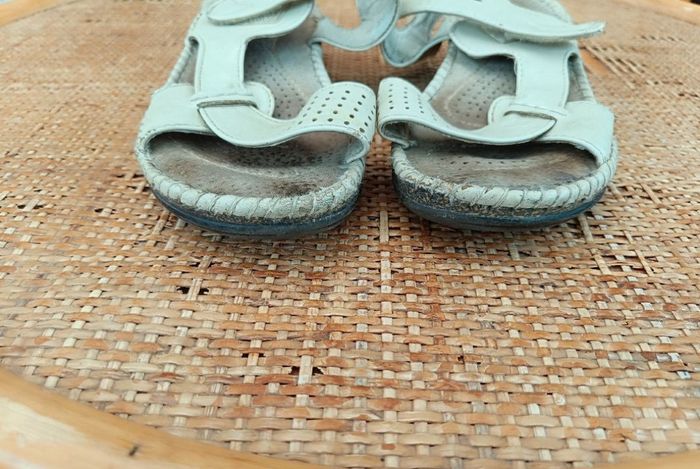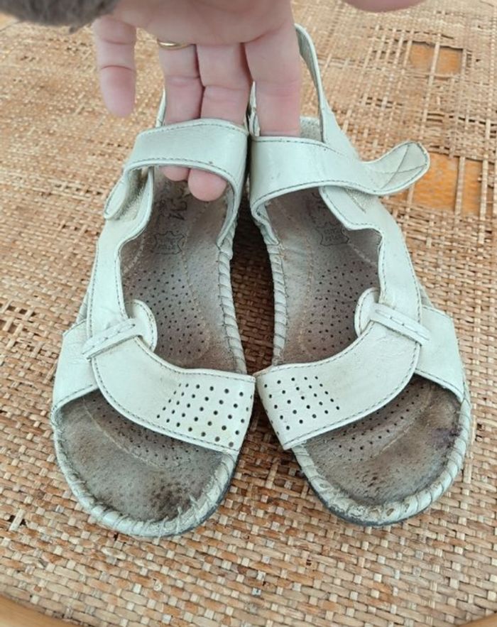Nu-pieds (sandalles) écru en cuir doublées " La Moda Futura" en p.36,5 avec une semelle cuir et fermeture velcro très confortable pour la marche ou loisirs et un bon maintien ( taille grand moi je fais du 37) BE