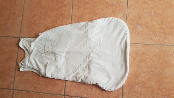 Gigoteuse bébé Taille 6-24 mois Couleur blanche inscriptions poitrine Sans manche Pression épaule Fermeture éclair Marque Kiabi