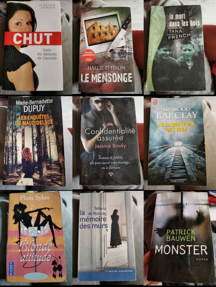 Livres : - Cette nuit là - monster - la mémoire des murs - blondes attitude - ne la quitte pas des yeux - confidentialité assuré - Les enquêtes de maud delage - la mort dans les bois - le mensonge - chut 5 euros l'unité