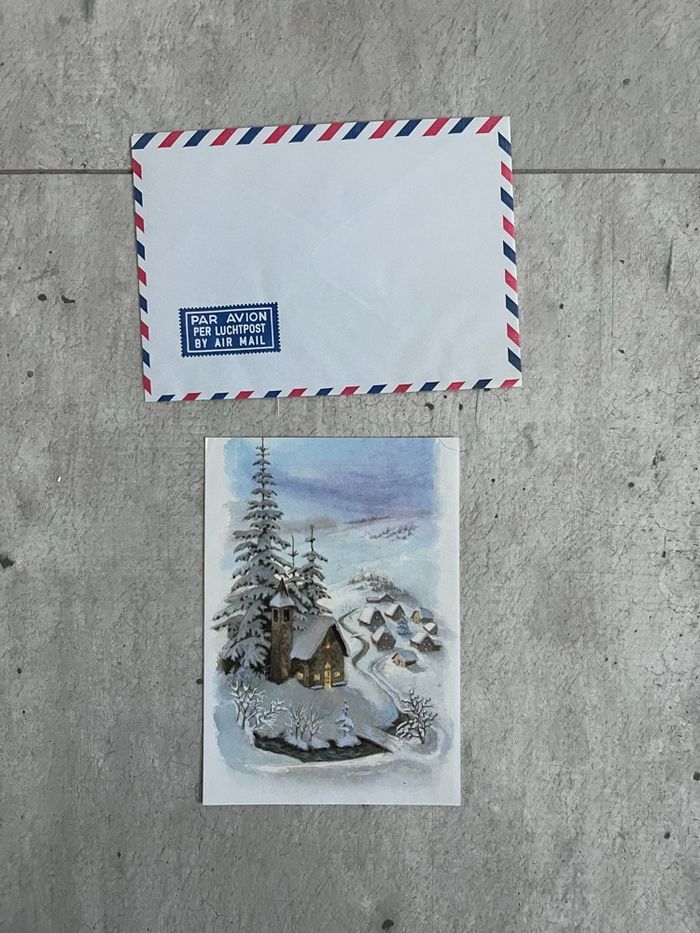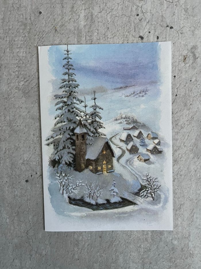 Je vends cette charmante carte postale représentant un village enneigé avec une maison illuminée au milieu des sapins. - Type de produit : Carte postale - Thème : Paysage hivernal avec village enneigé - Particularités : Enveloppe par avion incluse - Dimension : environ 14,8 x 10,4 cm - Jaunie par le temps Bon état N'hésitez pas à me contacter pour plus d'informations ou de photos. Envoie rapide et soigné