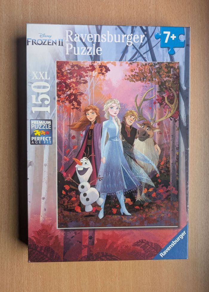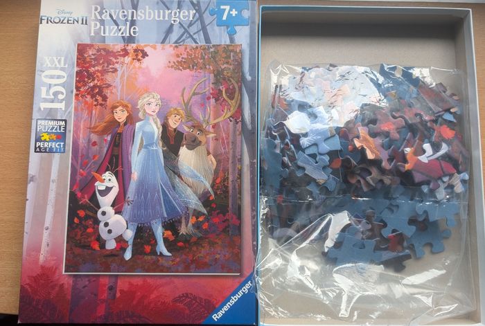 Puzzle Ravensburger de 150 pièces sur le thème du film La Reine des Neiges 2. L'illustration représente les personnages Elsa, Anna, Olaf, Kristoff et Sven dans une forêt aux couleurs d'automne. Dimensions du puzzle assemblé : 49 x 36 cm. Parfait pour les fans de l'univers Disney et des puzzles de qualité. Idéal pour un moment de détente en famille ou pour offrir.