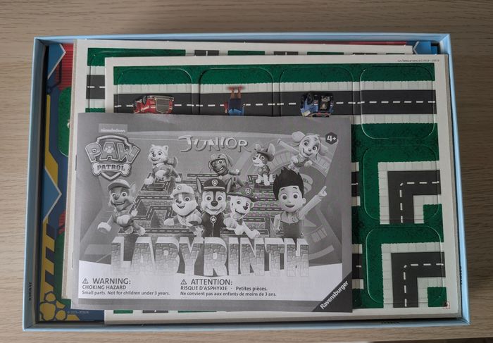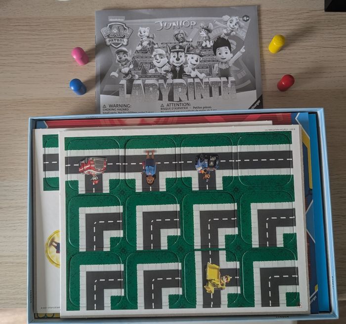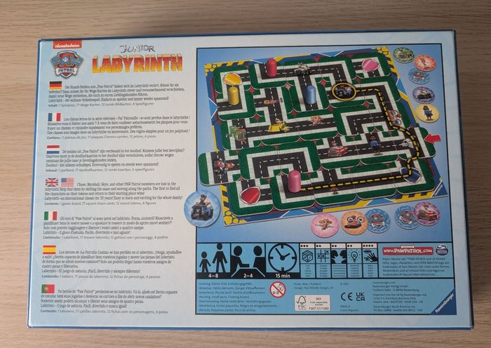 Jeu de société Junior Labyrinth sur le thème de la Pat' Patrouille (Paw Patrol), édité par Ravensburger. C'est un jeu d'observation et de déplacement idéal pour les jeunes fans de Ryder et de ses chiots !