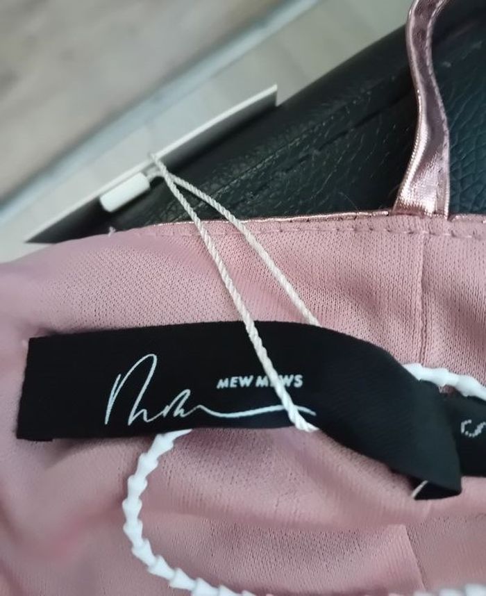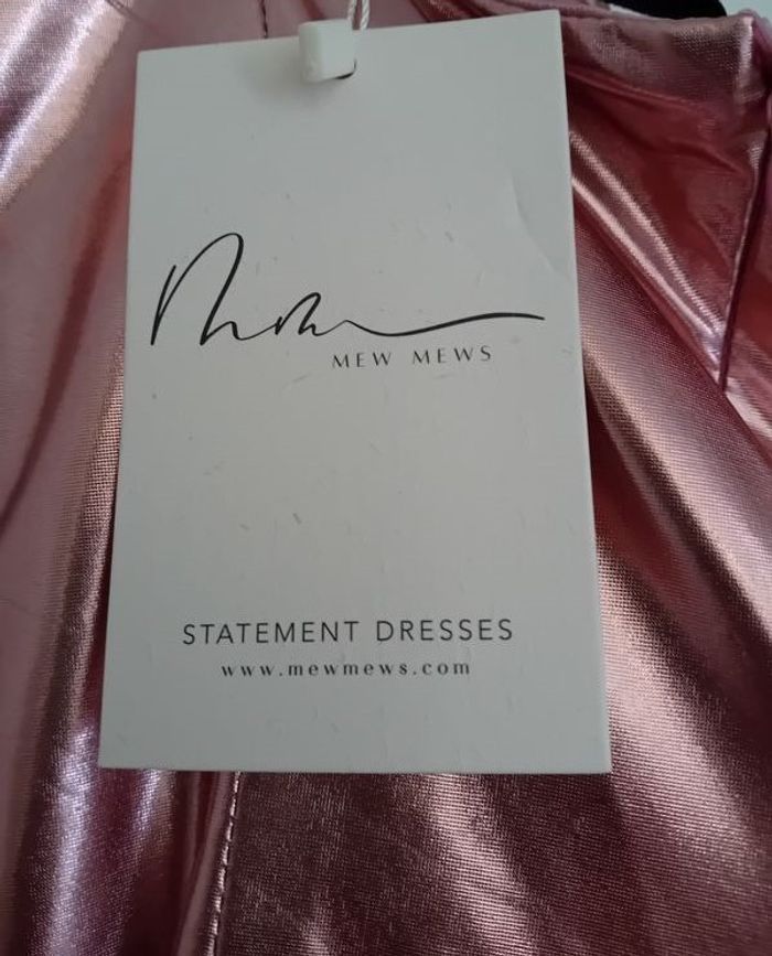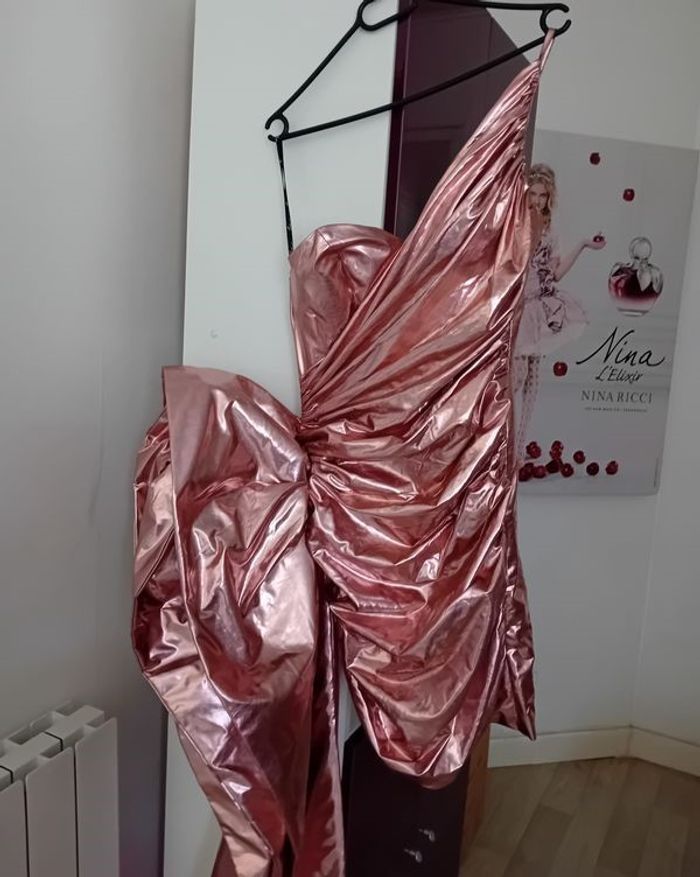 Vends 1 Robe Coktail Marque Mew Mews Rehaussez votre style avec la robe métallisée ornée d'un nœud Elmer. Le tissu métallisé et les ornements en nœud . Taille S/36 100 %Polyster Mesures de la Robe: Aisseles à aisseles 40cm Longueur 80cm Prix 60 euros Valeur 245 euros