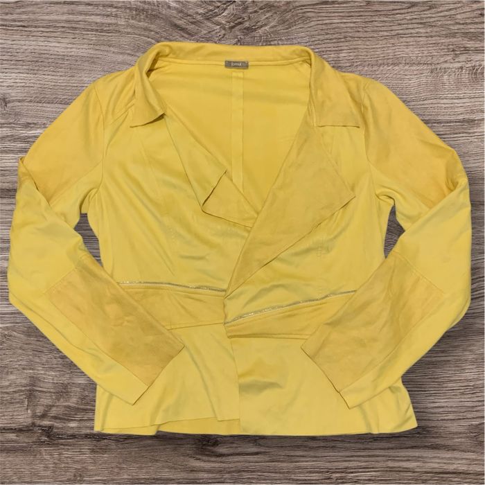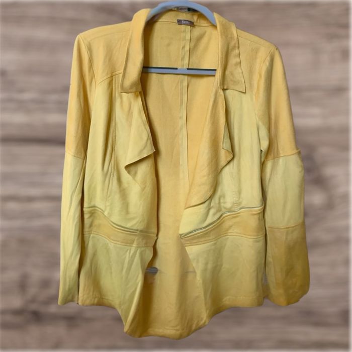 Très jolie veste en suédine imitation daim, dans un superbe ton pêche / jaune doux, très lumineux et facile à porter au printemps comme en automne. Marque formul. Coupe fluide avec un devant drapé, sans fermeture, qui donne une silhouette féminine et décontractée. Matière douce et agréable au toucher, effet « peau de pêche ». État : excellent, aucune tache, aucune usure visible. Dimensions (à plat) : • Sous aisselles : 51 cm • Bas : 51 cm • Longueur 56 Parfaite pour porter avec un jean, une robe ou un pantalon habillé. Très polyvalente et confortable !