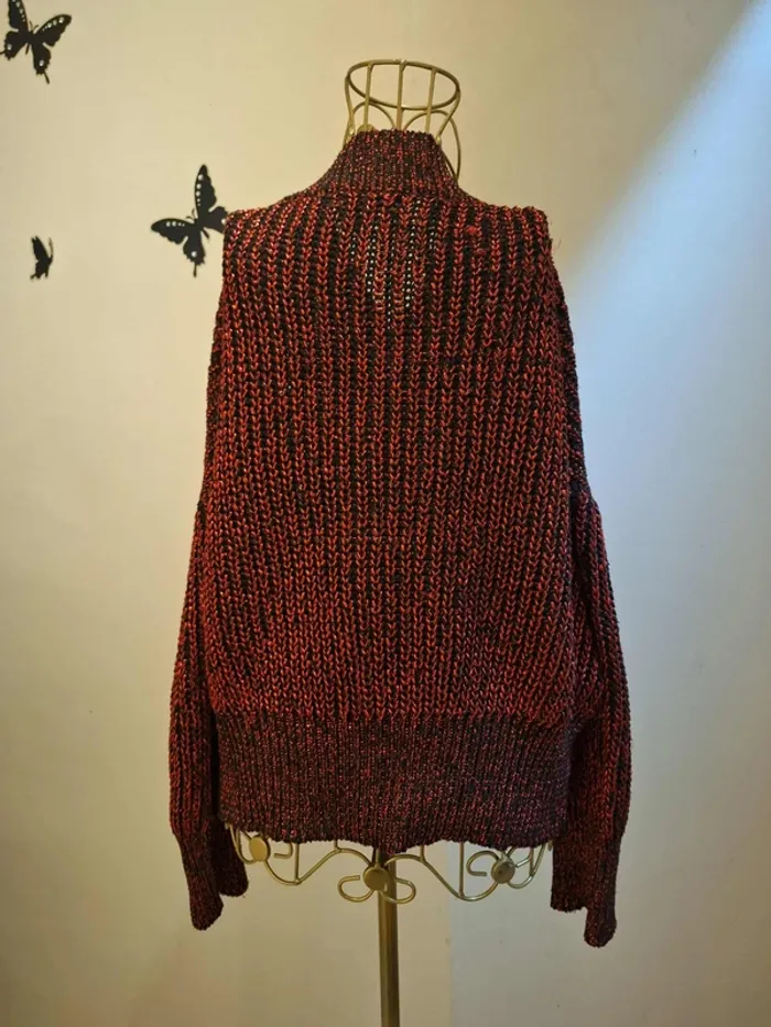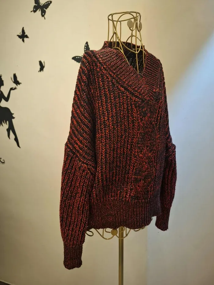 Pull en grosses mailles noires et mailles rouge métallisées donnant un effet scintillant subtile - col V - torsadé au milieu du pull - longueur 57 cm - coupe droite - taille unique idéale pour les tailles M & L ou 38 & 40 - état sans défaut ps : je ne fais pas de photo portée #pullrougenoir #pullgrossesmailles #pulltorsade #pullhiver