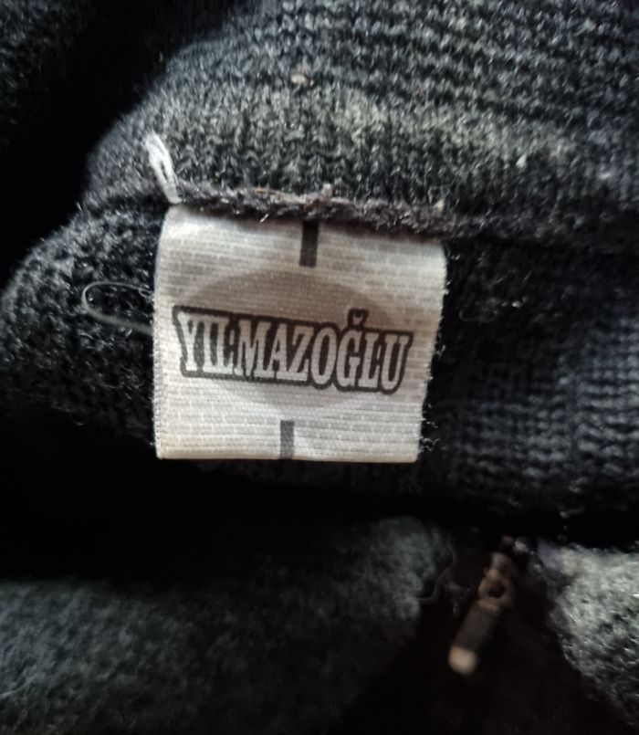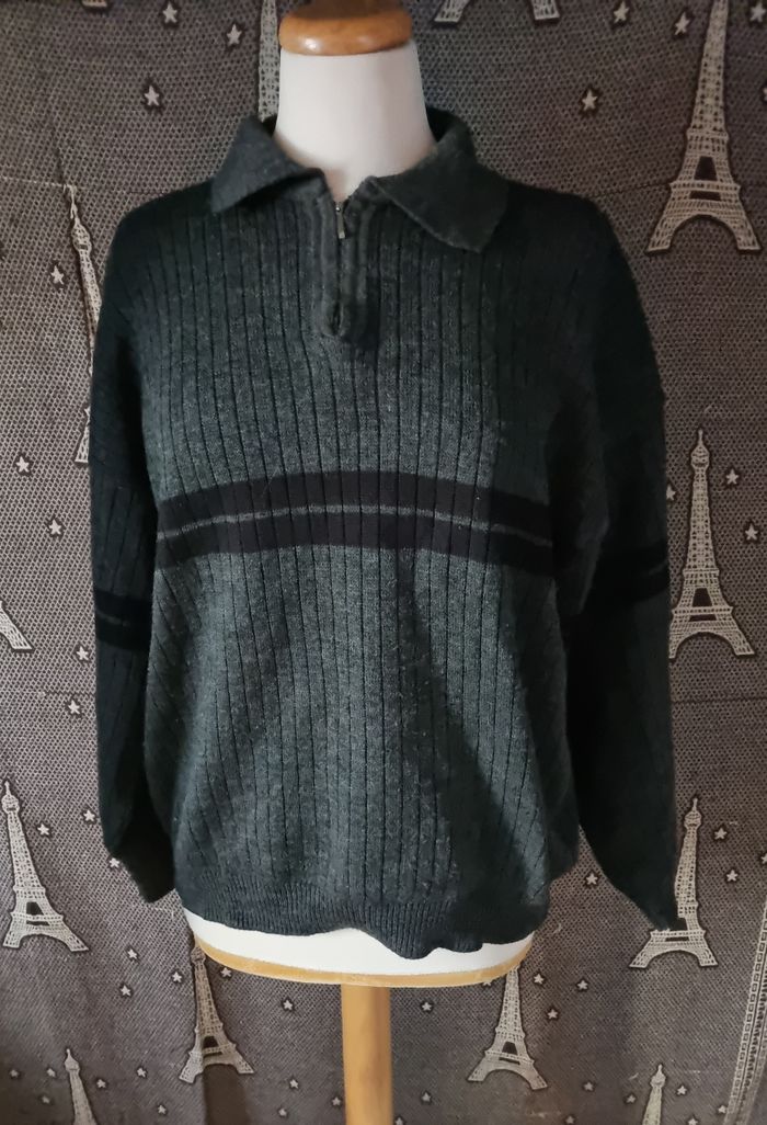 Pull d'hiver gris foncé à col zippée, taille L marque Yilmazoglu,longueur 63cm, largeur 53cm, longueur épaule à aisselle 23cm, largeur aisselle à aisselle 56cm, longueur manche 49cm.