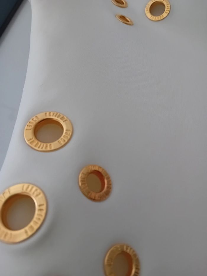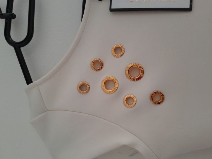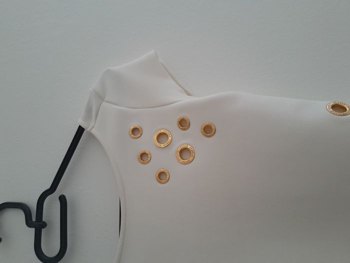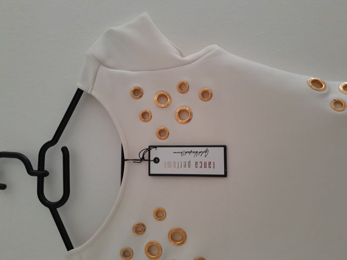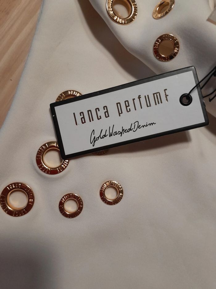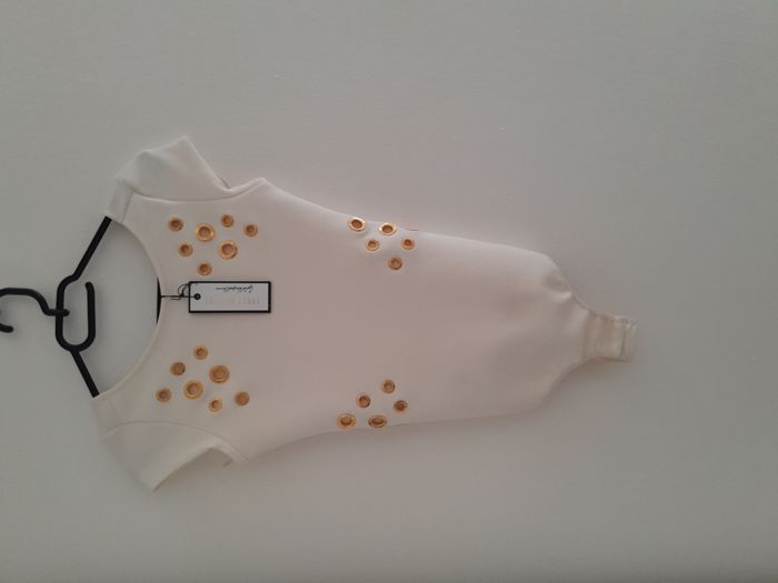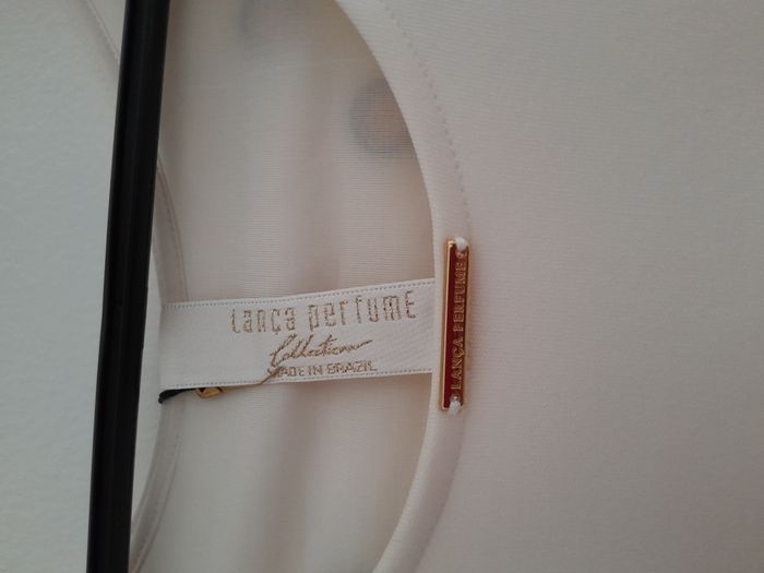 Vends 1 Magnifique body Marque Lança Perfume Luxueux et trés chic Avec plaque dorées inscriptions Lança Perfume Taille S/36 Couleur Ecru et Doré 87 % Polyster 13 % Elasthanne Prix 60 euros