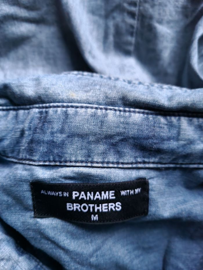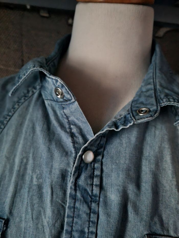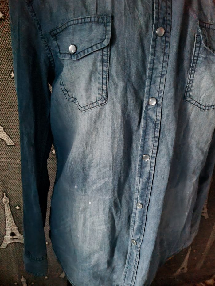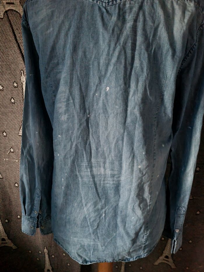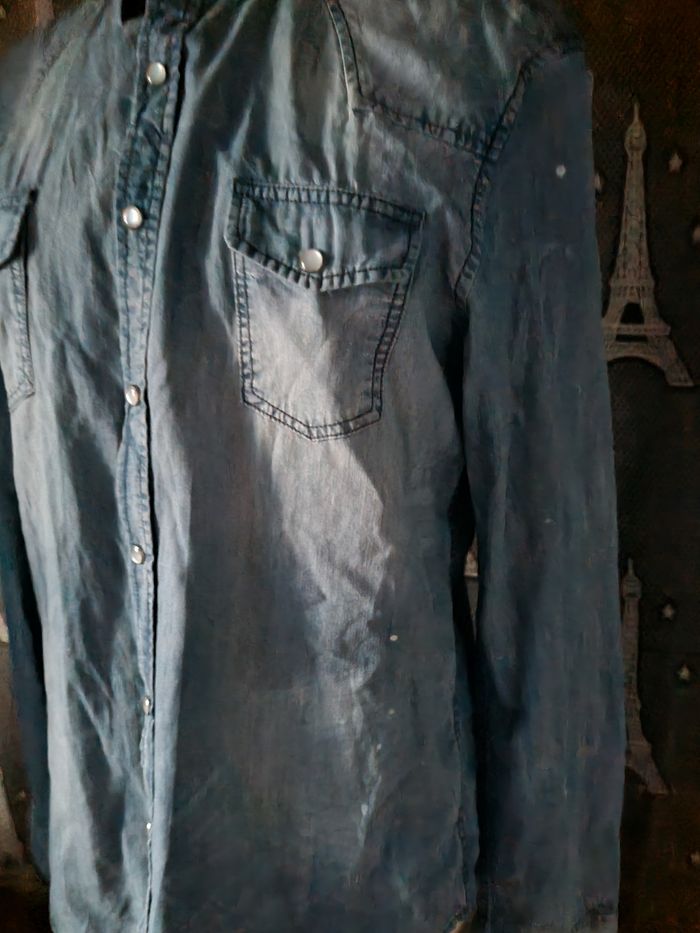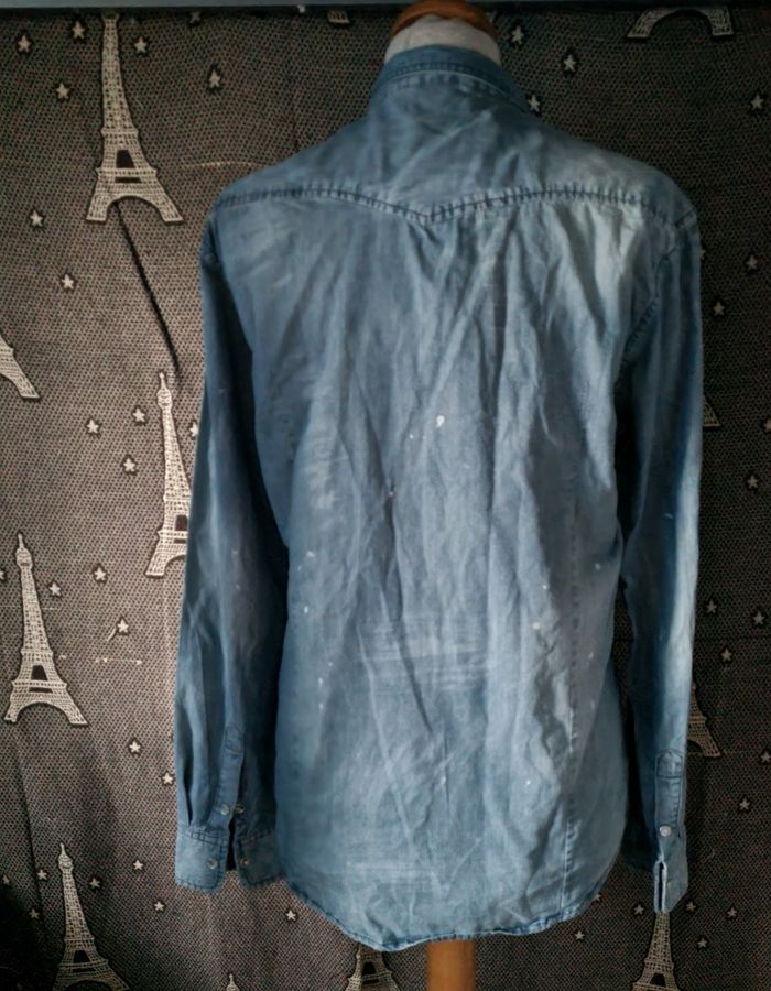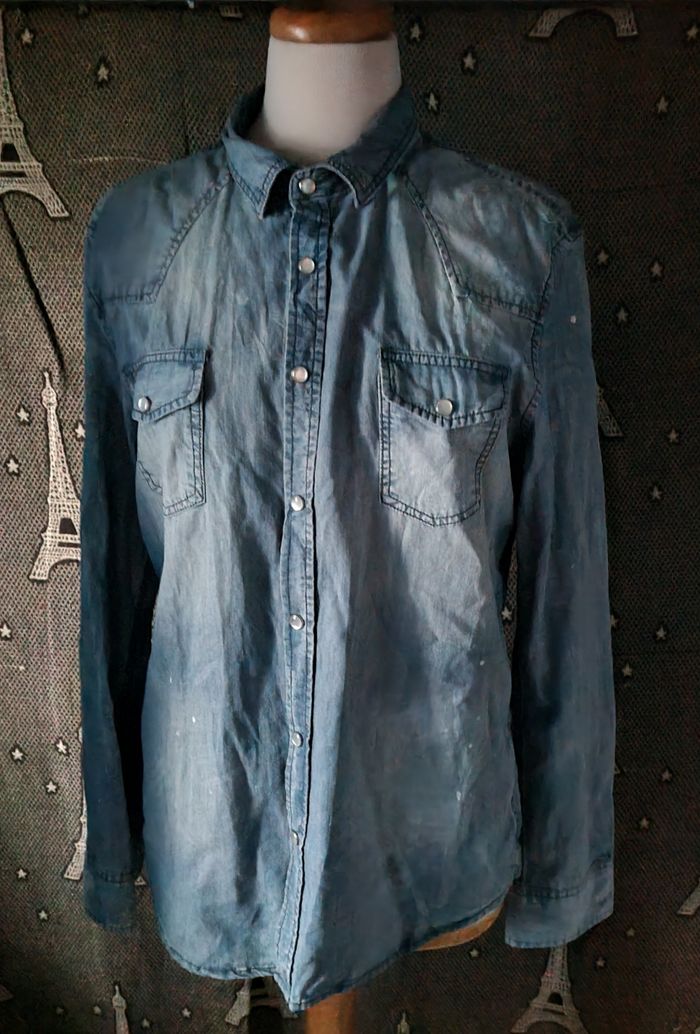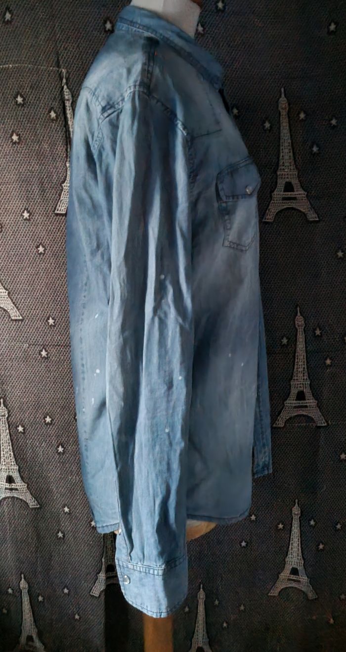 Chemise en jean à manches longues effet délavé avec effet taches de peinture, taille M marque Paname Brothers,fermeture pressions, 2 poches, longueur 68cm,largeur 49cm, longueur épaule à aisselle 20cm, largeur aisselle à aisselle 48cm, longueur manche 50cm,comme neuf porté 1-2fois (légèrement taché au col à l'intérieur voir dernière photo mais peu sûrement partir avec du détachant ).