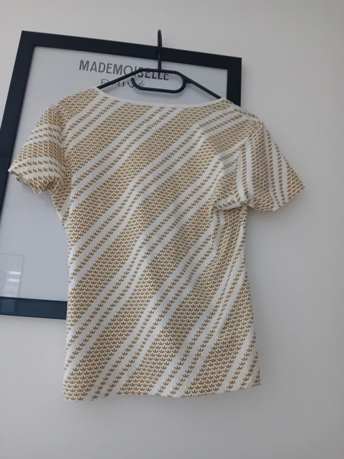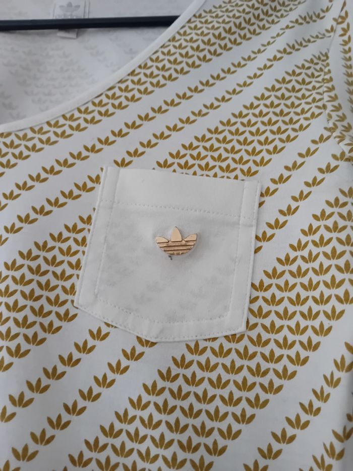 Vends 1 t-shirt Marque Adidas t-shirt white v-neck l Col V Couleur Beige et Doré Plaque Logo Adidas en acier doré Taille S mais Taille petit Donc Taille XS/34 Prix 15 euros