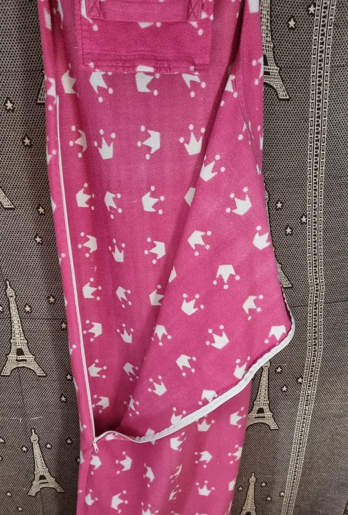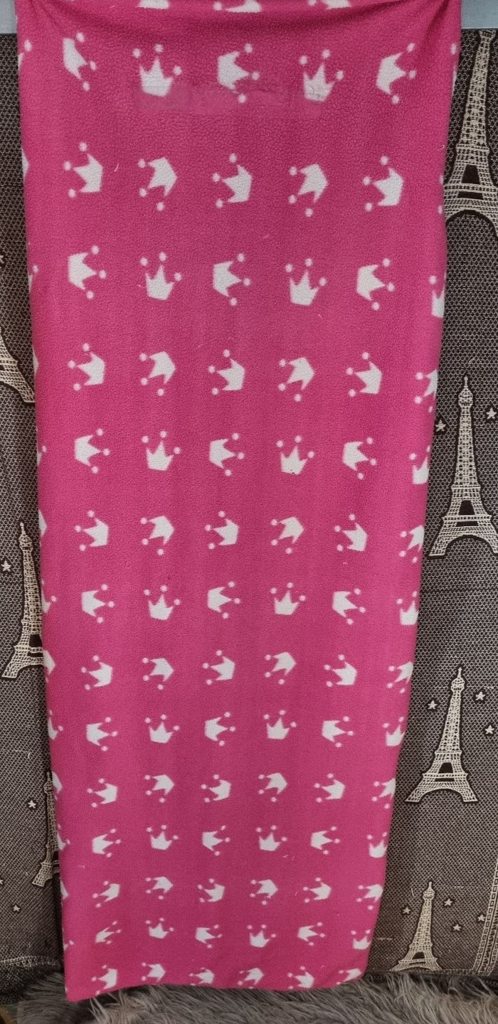 Sac de couchage rose à motifs couronne, fermeture zippée, longueur 154cm,largeur 53cm,manque les scratchs voir photo.