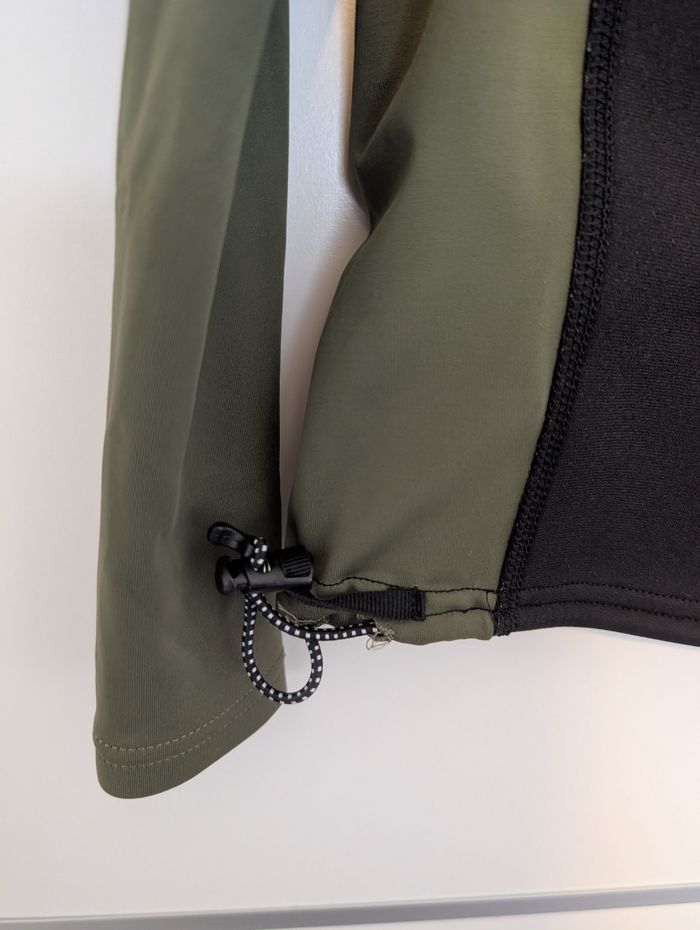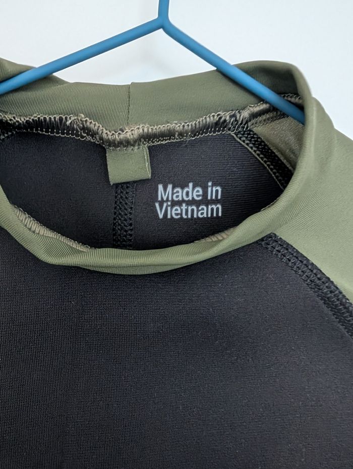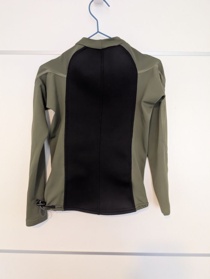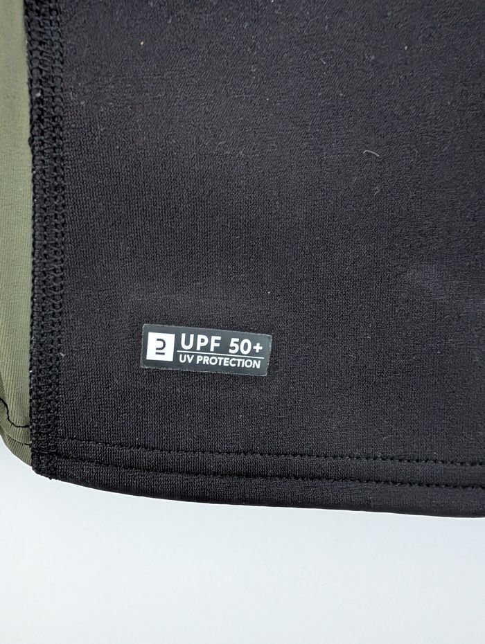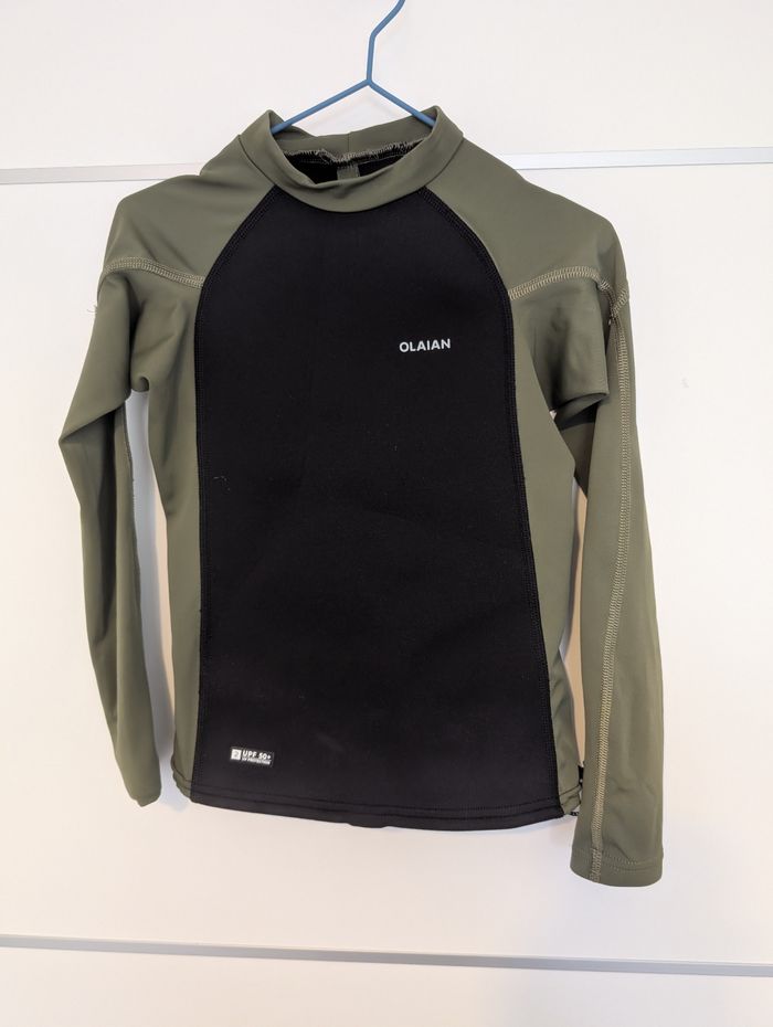 Haut de protection solaire à manches longues de la marque OLAIAN (marque de sports nautiques de Decathlon), parfait pour la plage, la natation, ou les sports aquatiques. Couleur Vert kaki / noir