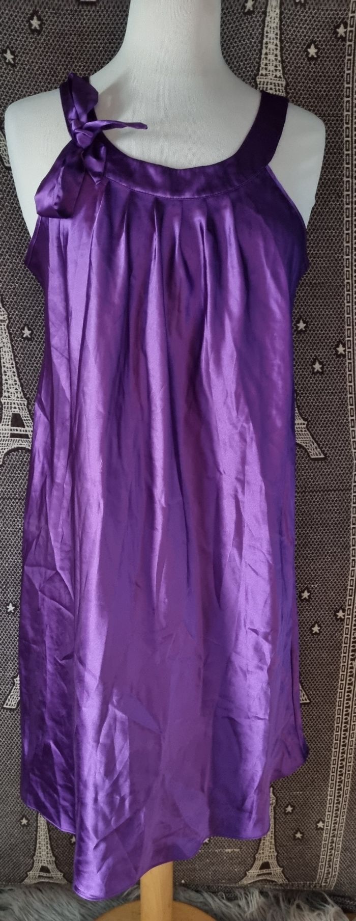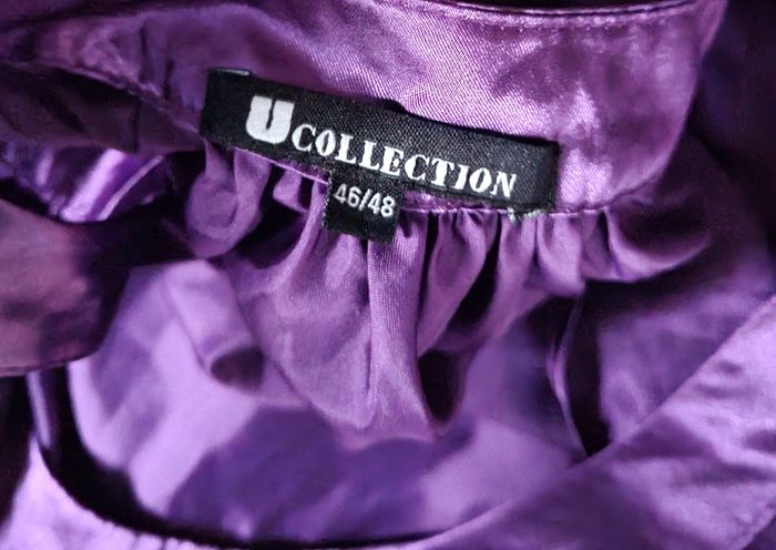 Tunique violette effet satin, taille 46-48 marque U collection, longueur 94cm, largeur 65cm, longueur épaule à aisselle 24cm, largeur aisselle à aisselle 54cm.