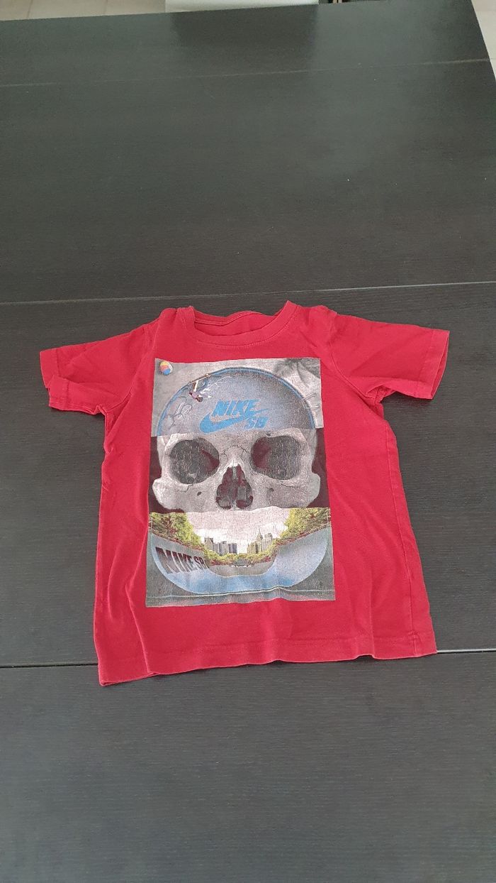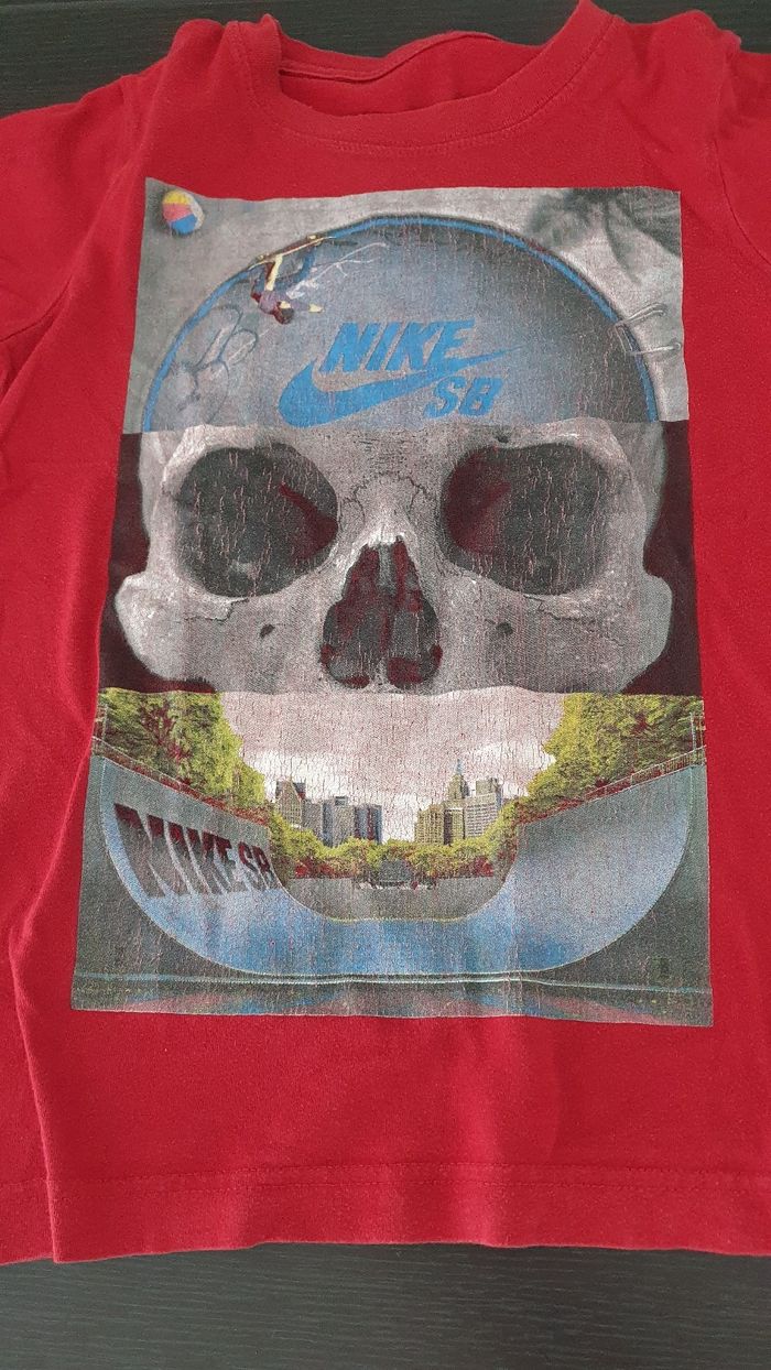 Je vends ce t-shirt enfant Nike de couleur rouge bordeaux avec un motif de crâne et de paysage urbain. En très bon état.