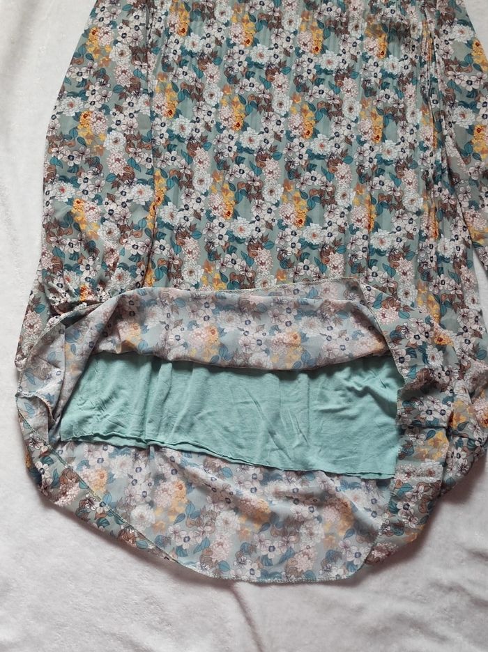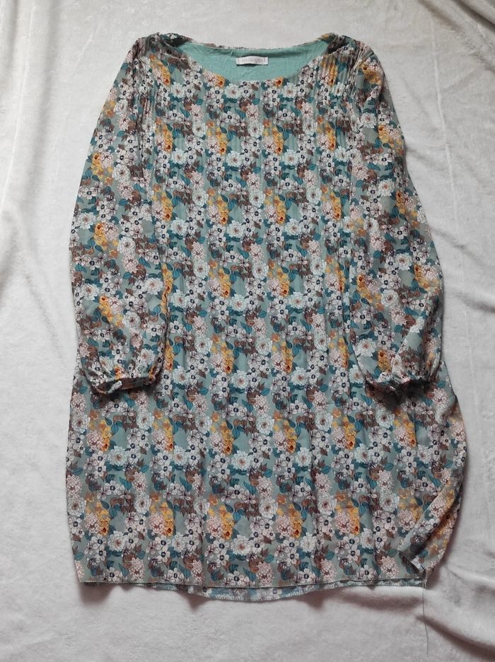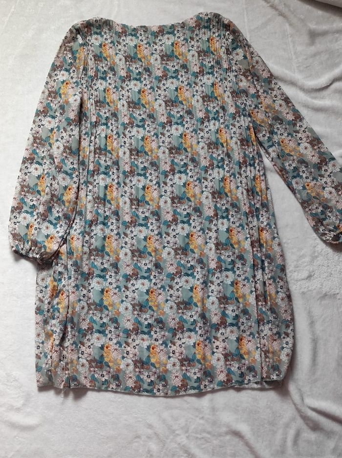 robe courte ( ou longue blouse ) avec manches mi longues. Intérieur doublé, extérieur plissé à imprimer fleuri sur fond vert clair. Marque new collection en taille unique. 100% polyester et 95% viscose, 5% elasthanne. Dimensions Épaules 45 cm Aisselles 55 cm Longueur 88 cm Doublure intérieure 52 cm En parfait état, aucun trous tâches ou déchirures.