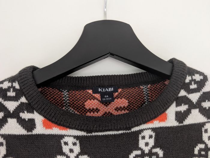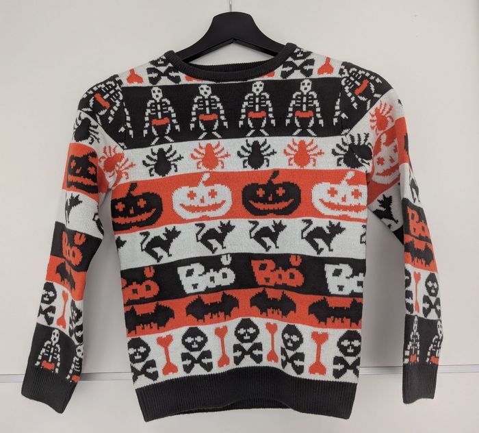 Ce pull Kiabi, idéal pour Halloween ou pour un look décalé, est plein de motifs festifs : des squelettes, des citrouilles, des chats noirs et des chauves-souris. Les couleurs sont vives (noir, blanc, orange) et le pull est bien chaud. Il est en excellent état, peu porté. Parfait pour un enfant qui aime l'originalité !