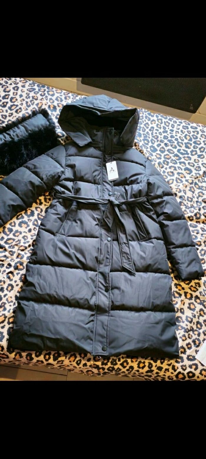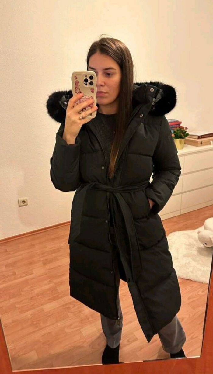 Manteau matelassé avec fermeture éclair et capuche pour femmes, à couleur unie noir avec bordure en fausse fourrure détachable,