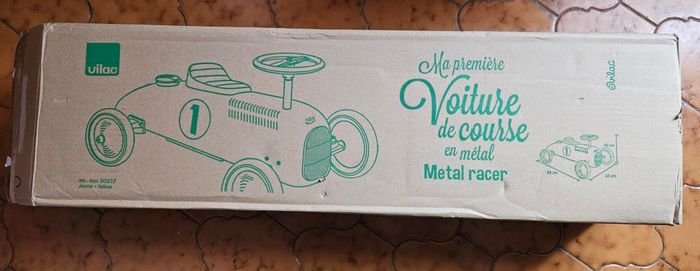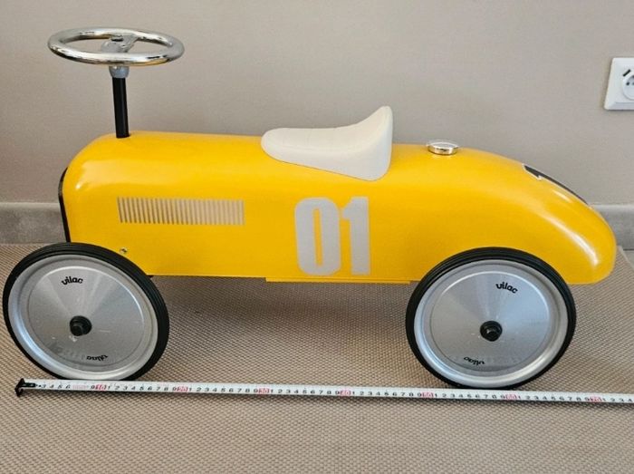 Voiture porteur en métal totalement neuve. Jamais utilisé, jamais monté, tout est encore dans l'emballage. Les roues sont à monter (quelques minutes). J'ai ouvert le carton d'emballage pour faire les photos. C'est comme si vous l'achetiez neuve en magasin. La photo de face est une illustration pour vous montrer le modele avec les roues. Marque française VILAC Couleur jaune moutarde Numéro 01 façon voiture de course Ideal pour un garçon fille de 18 mois à 5ans Cadeau idéal pour NOEL au pied du sapin Dimensions visible sur l'une des photos Envoi possible en supplément Remise en mains propres sur TOULOUSE ROSERAIE ou MURET