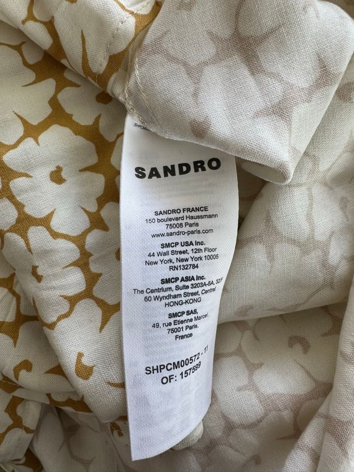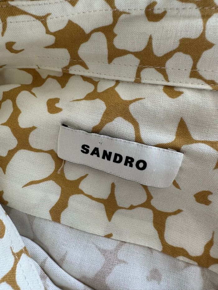 Chemisier - Excellent état - Taille 40 équivalent L Dimensions en bas de l’annonce - Marque Sandro - Marron moutarde et blanc - Imprimés fleurs - 100% Viscose Dimensions: - 52cm niveau aisselles - 66cm de long à l’avant - 74cm de long à l’arrière