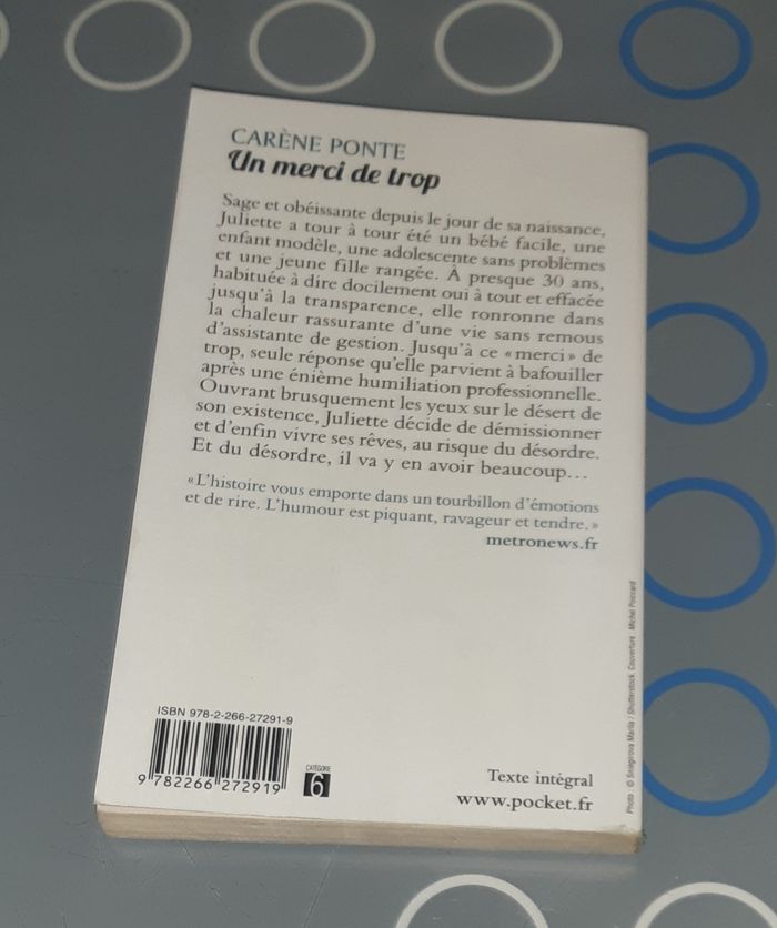 Livre Un merci de trop De Carène Ponte Coins cornés Très bon état Humour, Amour, un livre qui donne la banane !!!!!! Juliette arrête d'être gentille. A son travail elle en a assez d'être prise pour une imbécile elle claque la porte. Elle veut réaliser son rêve devenir écrivain. Oui mais c'est sans compter un petit imprévu... Elle pourra compter sur Nina son amie. Et son beau voisin Luc sera aussi bien présent. Super bien !