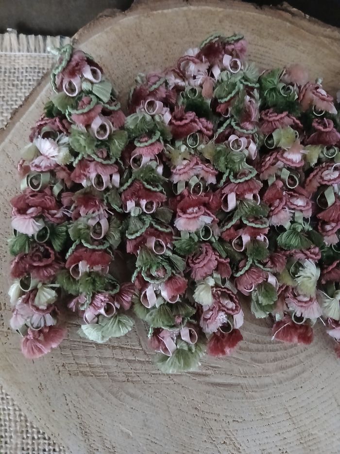 Lot de 9 pompons long guipure rose et vert D'autres breloques perles pompons boutons biais tissu ect de dispo ds mon dressing n'hésitez pas à jeter un coup d'œil ou à me demander