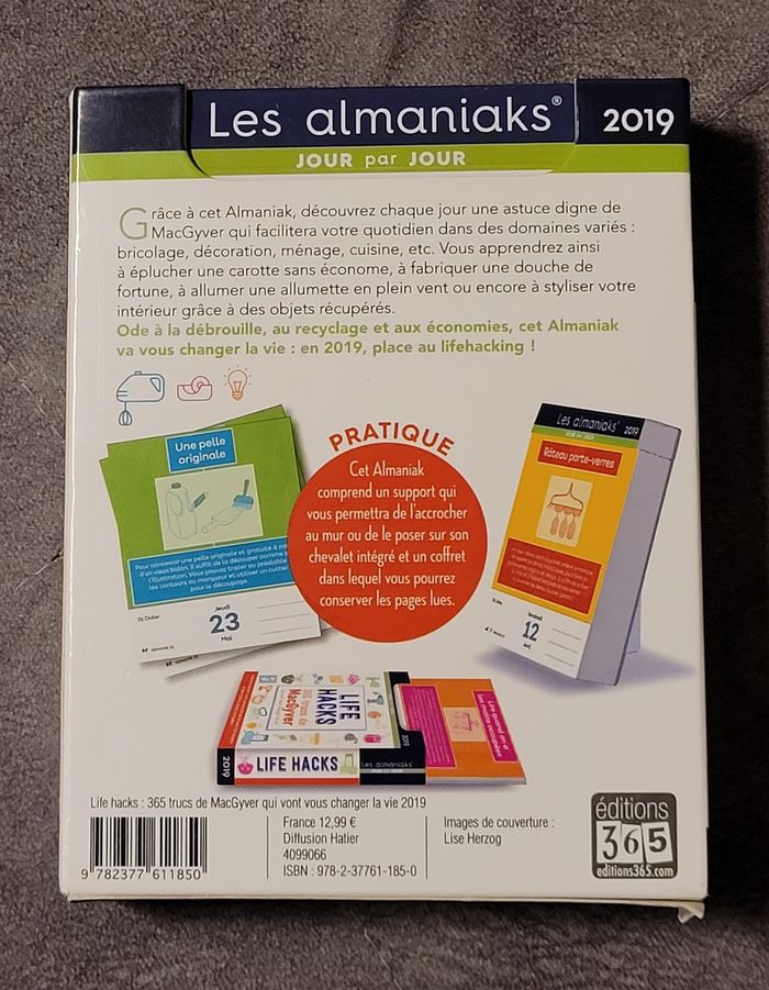 Bonjour, Je vends - Almaniak Life hacks - 365 trucs de MacGyver qui vont vous changer la vie 2019: Comment ouvrir une bouteille de vin sans tire-bouchon et 364 autres astuces. Yiannis Lhermet, Lise Herzog (Illustrations) - en très bon état. Si vous rechercher un livre ou un acteur en particulier et pour gagner du temps, n'hésitez pas à me le demander, je vous répondrais dès que possible 😇 Veuillez vous abonner pour recevoir toutes les nouveautés Pour autres infos n'hésitez pas à me contacter. ***** Merci de votre visite *****